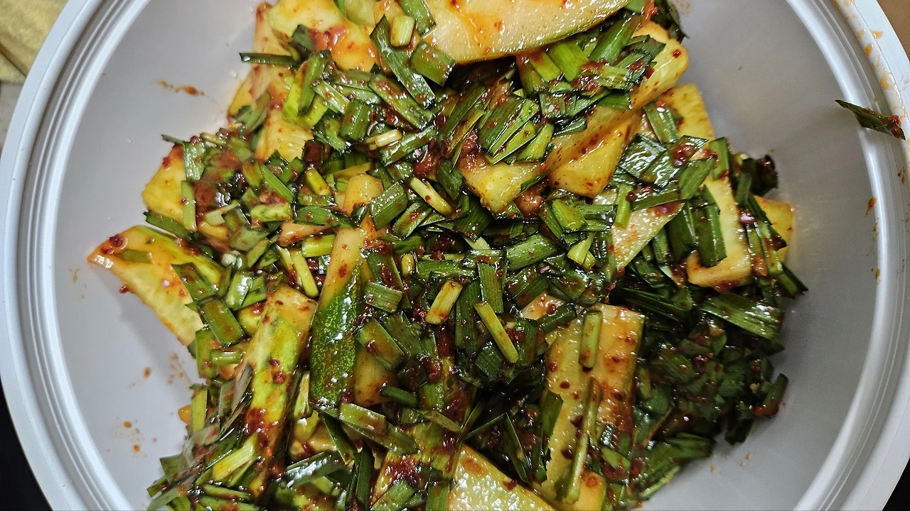 5. 잘라진 오이와 부추를 양념을 섞어 통에 잘 담아 냉장고에 보관한다.
