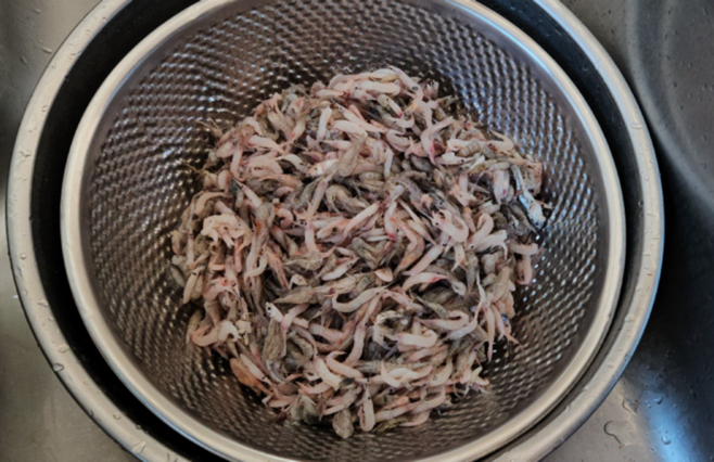 “오늘 내가 산 새우가 보리새우인데 감칠맛이 더 깊고 저걸로도 새우젓을 담근데.”