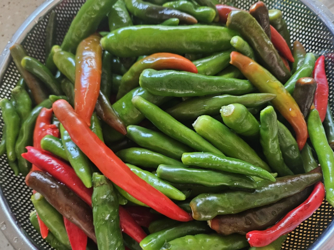 꼭지를 떼어내고 물로 씻어 놓은 고추가 참 예쁘다.
