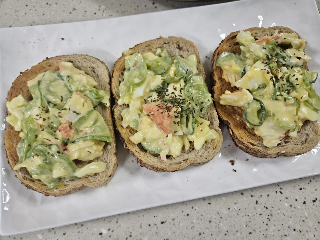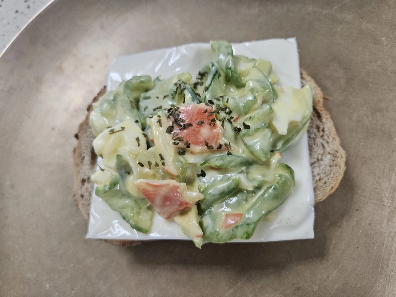 구운 호밀빵에 체다치즈 한 장을 올리고 그 위에 오이샐러드를 올려봤다.