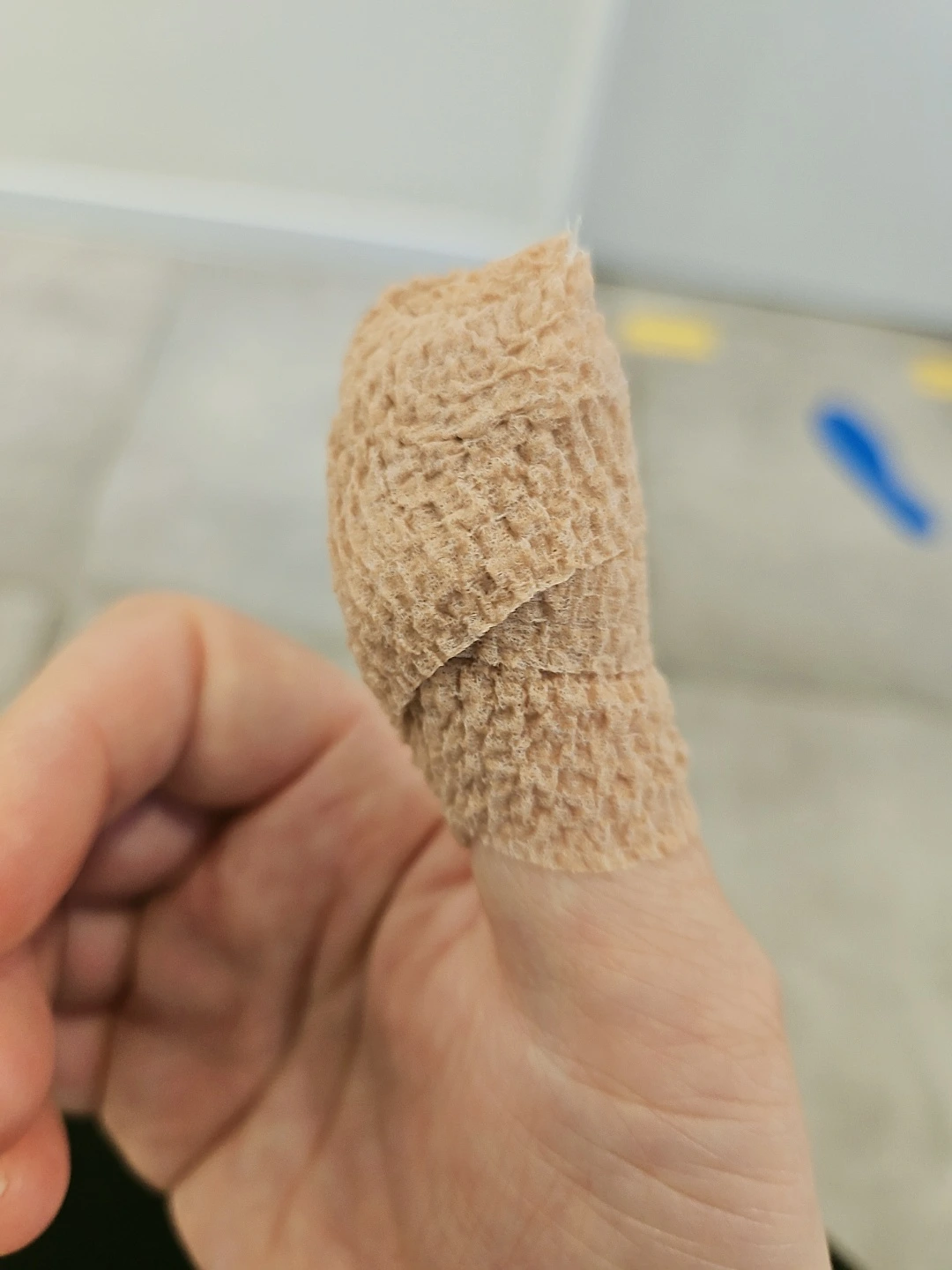 처치를 받고 밴딩으로 인해 엄청 커진 내 엄지손가락을 쳐다봤다.