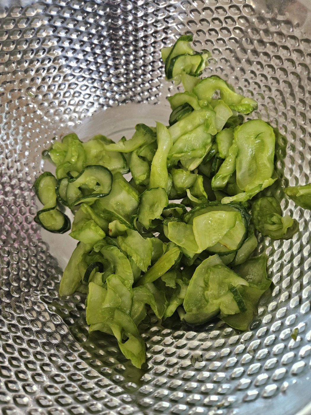 나는 아들보고 좀 들어달라고 큰 소리로 나의 요리 진행과정을 입으로 말하면서 오이를 채 썰고 있던 중에..