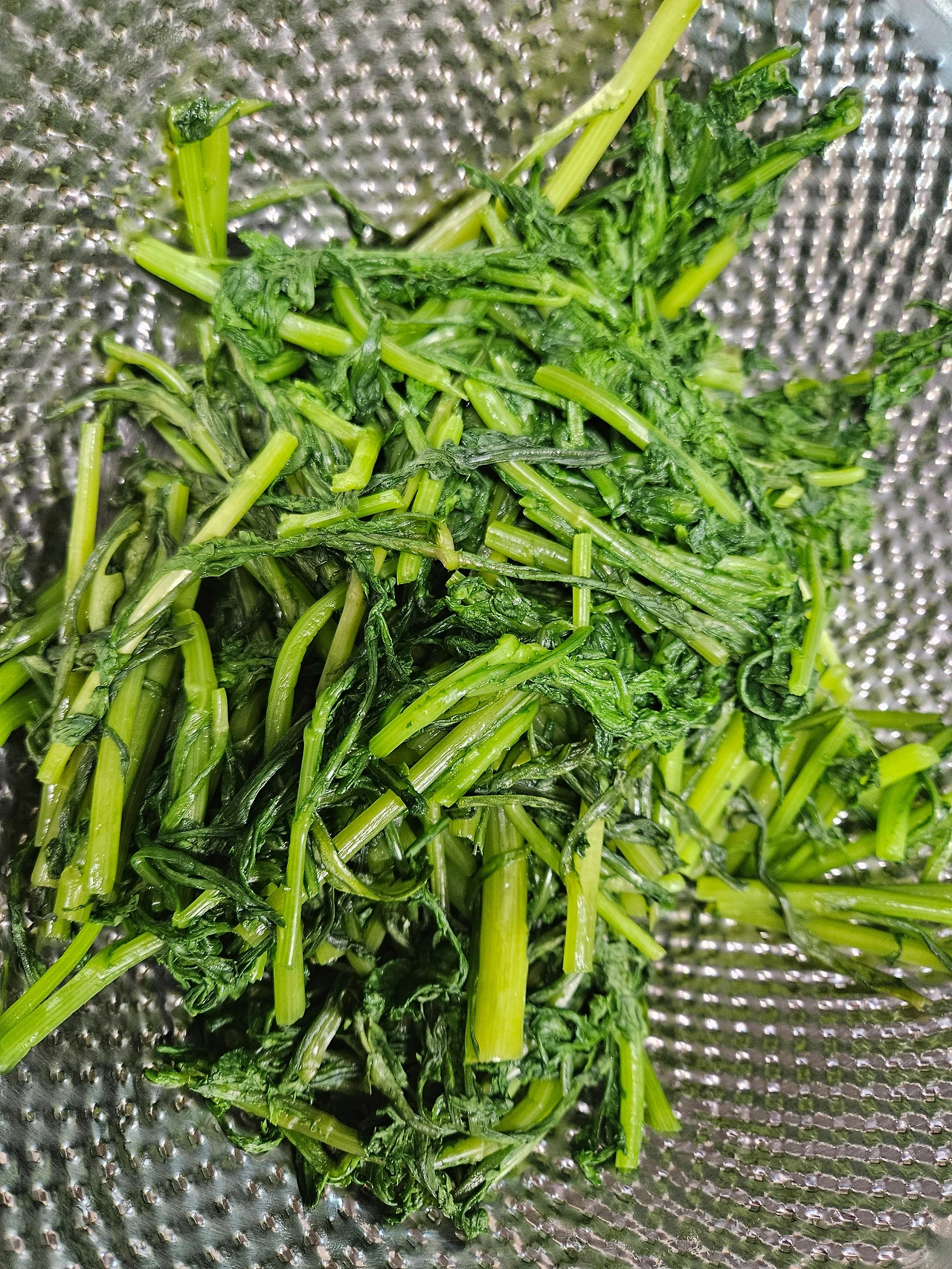 데친 쑥갓은 찬물에 여러 번 씻어 뜨거운 기운을 날린다.