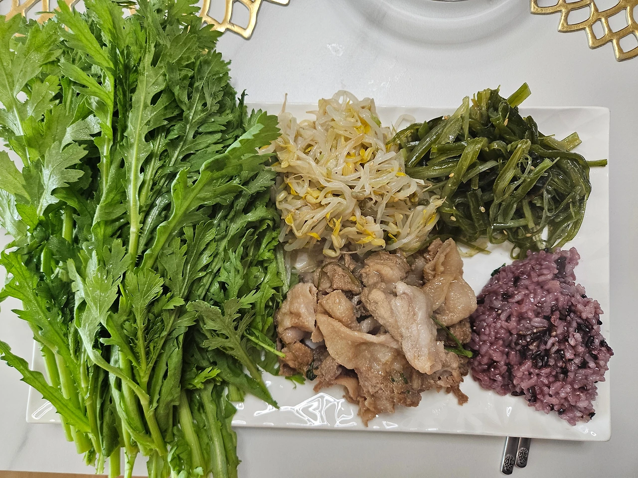 식사를 하는데 나는 생 쑥갓으로 먼저 먹고 있는데 딸이 말한다.