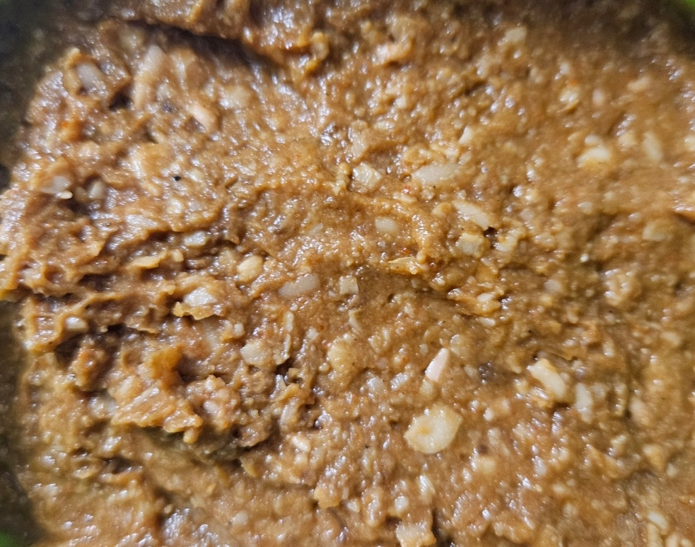 촉촉한 삶은 콩과 섞고 있는 나의 누룽지된장이다.