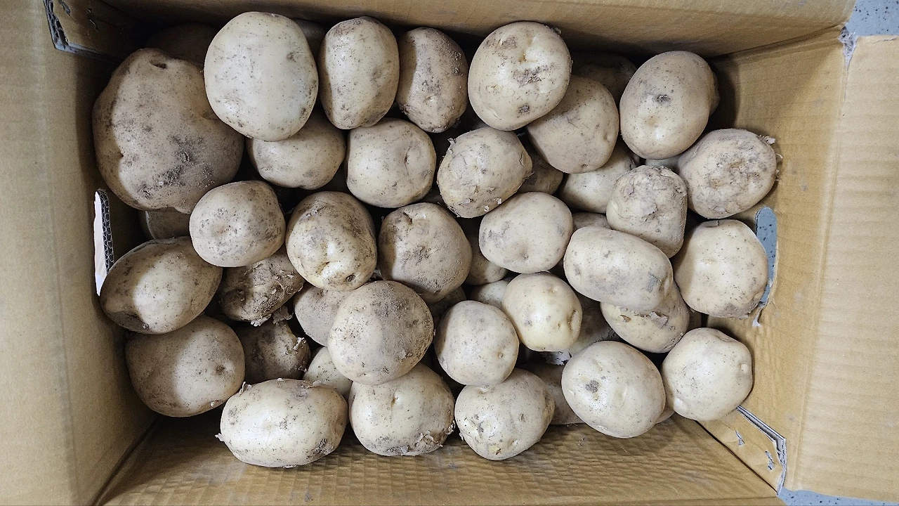 감자박스엔 감자 두 개의 그림 실물처럼 보이고 박스에 흙이 묻어있는 걸 보니 왠지 갓캐온 감자 느낌이랄까?