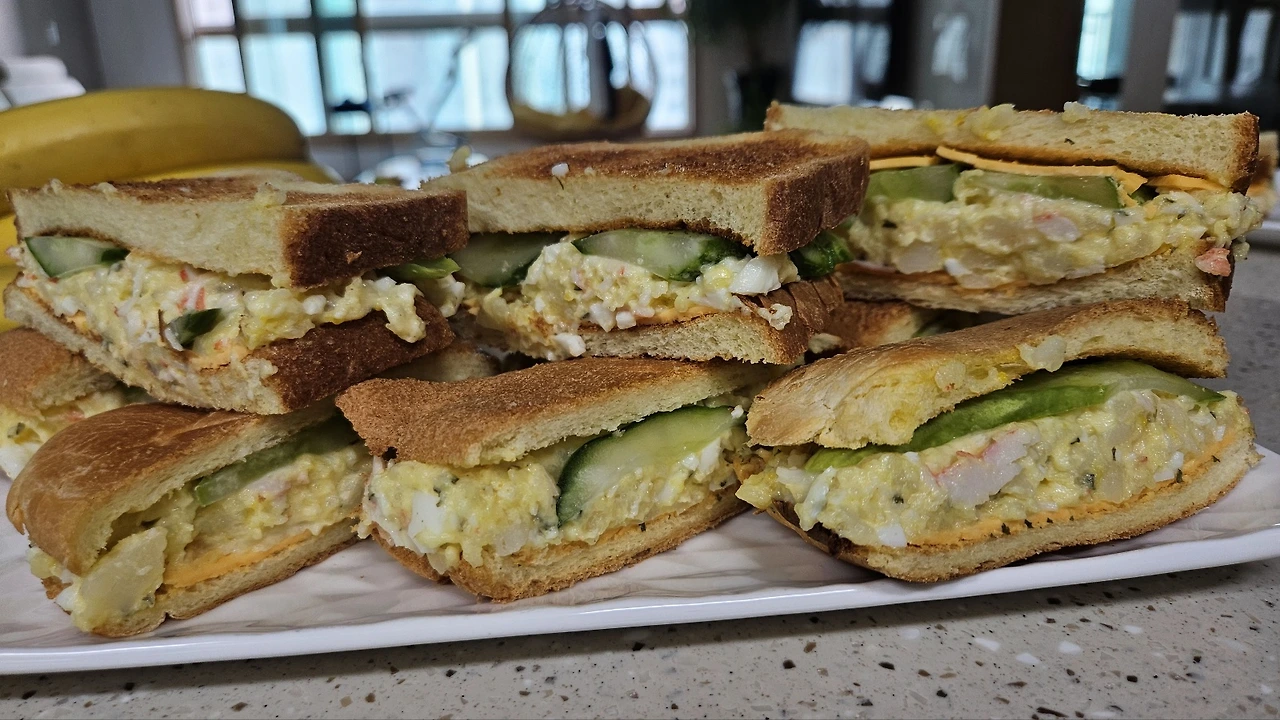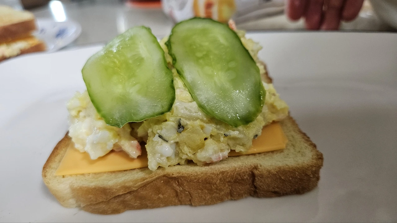 구운 식빵에 치즈를 넣고 감자샐러드를 듬뿍 올리고 위에 오이를 놓는다. 식빵을 맨 위에 덮어 완성한다.
