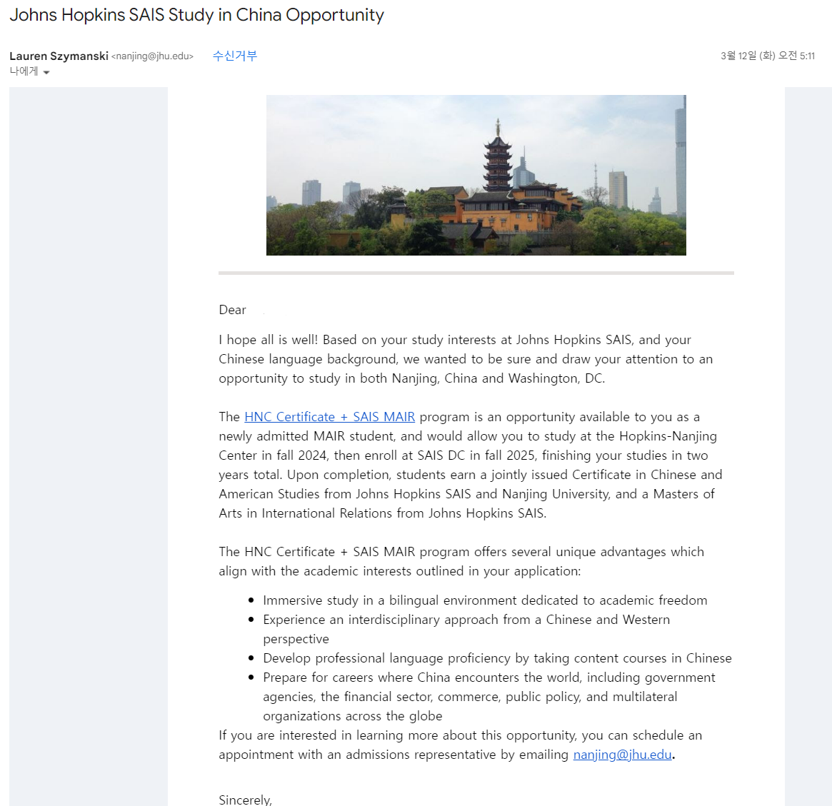 SAIS 워싱턴 캠말고도 유럽 캠퍼스가 있는데 그건 이태리 볼로냐에 있다. 중국 난징에서도 공부할 수 있는 듯하다 (내가 이걸 왜 아냐면... 그건 아래 참조..).