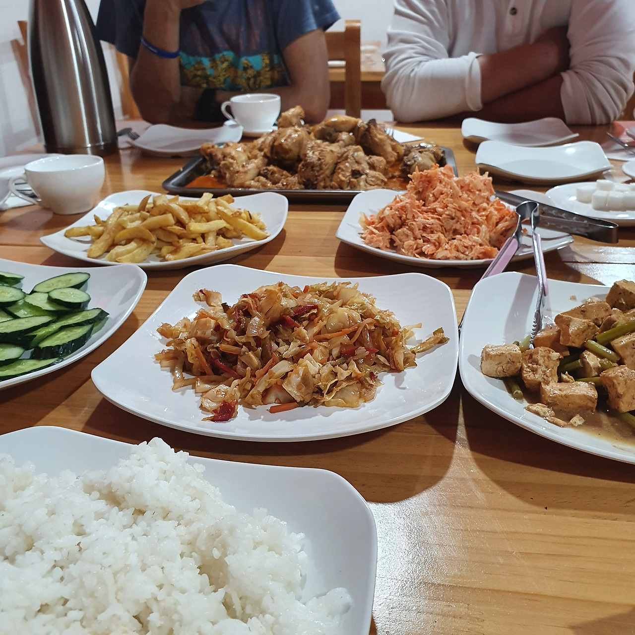 닭고기, 당근샐러드, 감자튀김, 두부, 오이, 밥. 그리고 숙소 앞의 저녁 가득한 설레임!