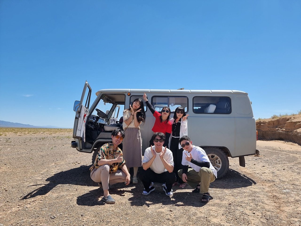 사막의 시작을 대하는 우리 6인의 자세! 포즈를 잡고, 관망하고, 촬영하고, 저~ 멀리 응가하고.