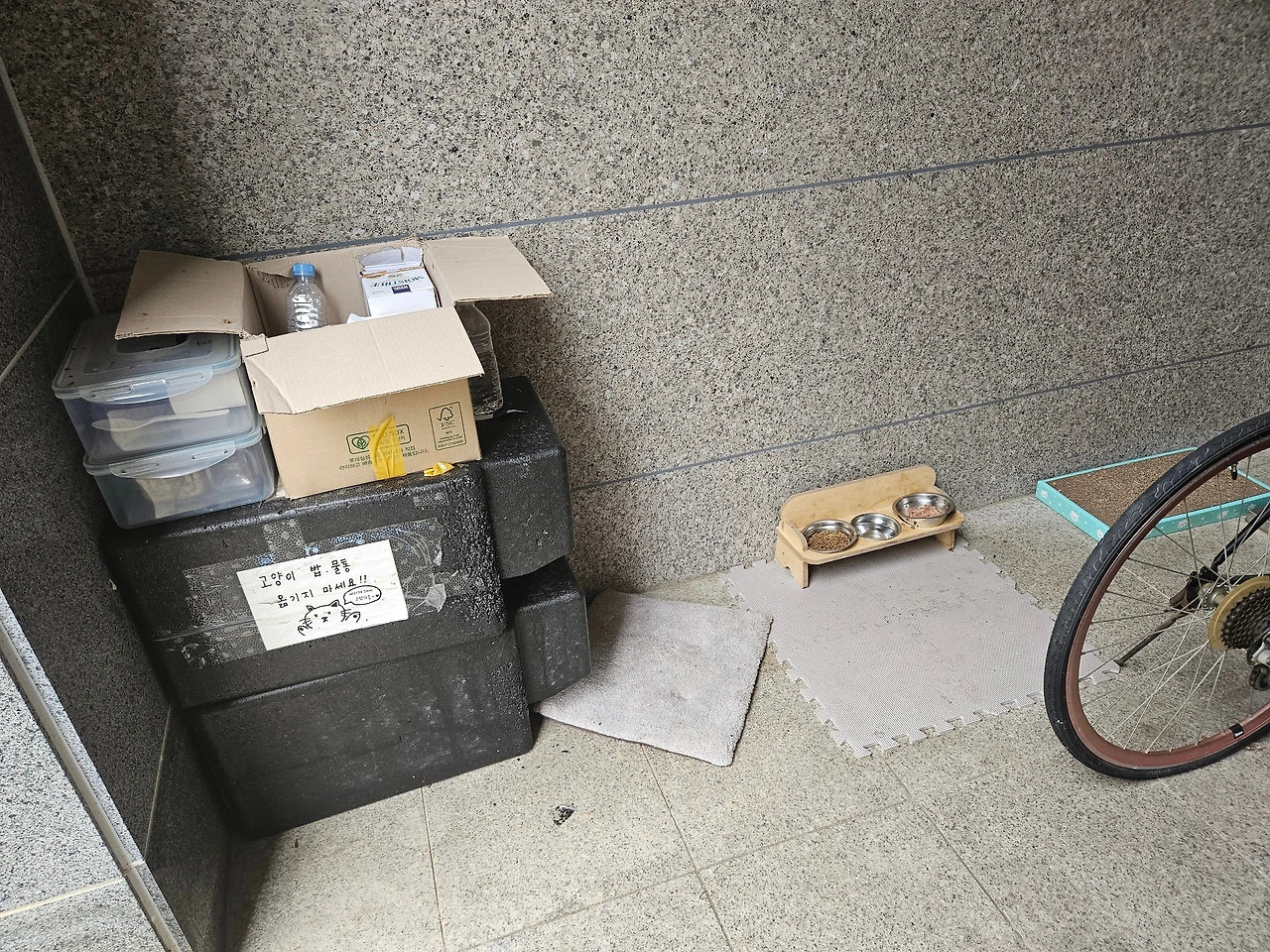 단이가 한 곳에 붙어있는 모습을 잘 보지 못했기에 아마도 어디로 가버렸을지도 모를 텐데, 그럼 물이라도 채워주고 오면 언젠가 먹겠지 생각하며 105동 쪽으로 발걸음을 재촉했다. 그런데 단이는 기둥 옆에 얌전히 앉아 있다가 나를 보더니 야옹 했다. 마치 “왔어?” 하는 것 같이.