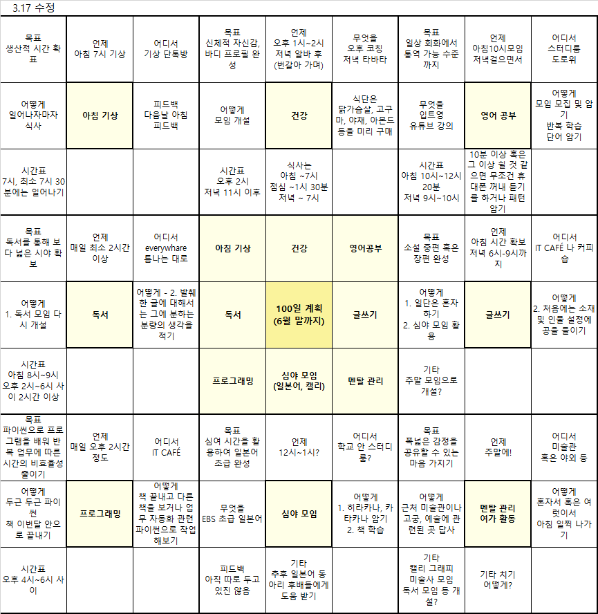 《약 3개월 간의 만다라트 양식을 수정한 계획표》