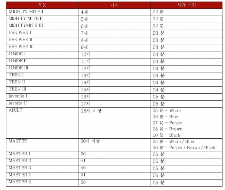 ※ 한국 주짓수 협회(KBJJA)에서 안내하는 나이와 시합 시간에 관한 공식적인 규칙(나이는 만 나이 기준).