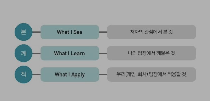 본깨적 책 읽기란 저자의 핵심을 제대로 보고(본 것), 그것을 나의 언어로 확대 재생산하여 깨닫고(깨달은 것), 내 삶에 적용하는(적용할 것) 책 읽기를 의미한다.