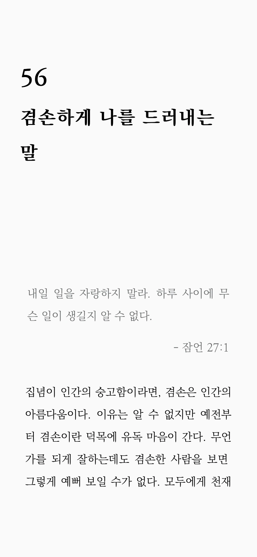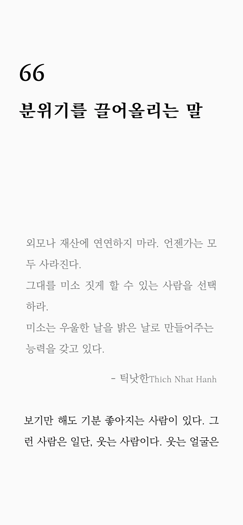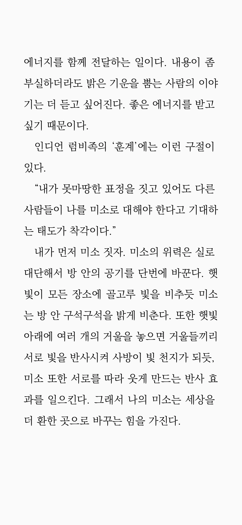 그 자체로 메시지가 되는 인생을 사는 사람이라면 애써 의식하지 않아도 그의 사소한 말에조차 깊은 울림이 있는 메시지가 깃들어 있을 것이다.