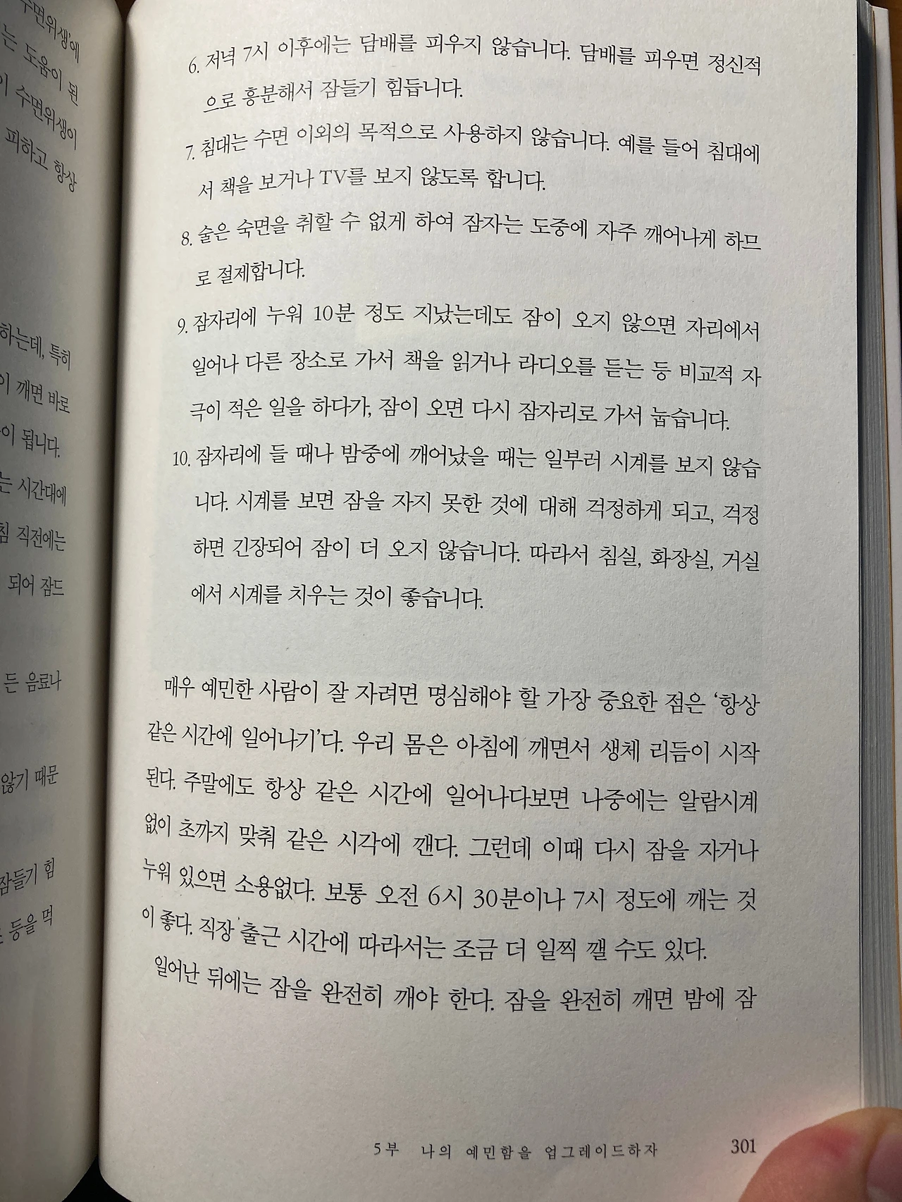 9 잠자리에 누웠는데 10분 동안 잠이 안 오면 다른 일 하다가 다시 자러 가기