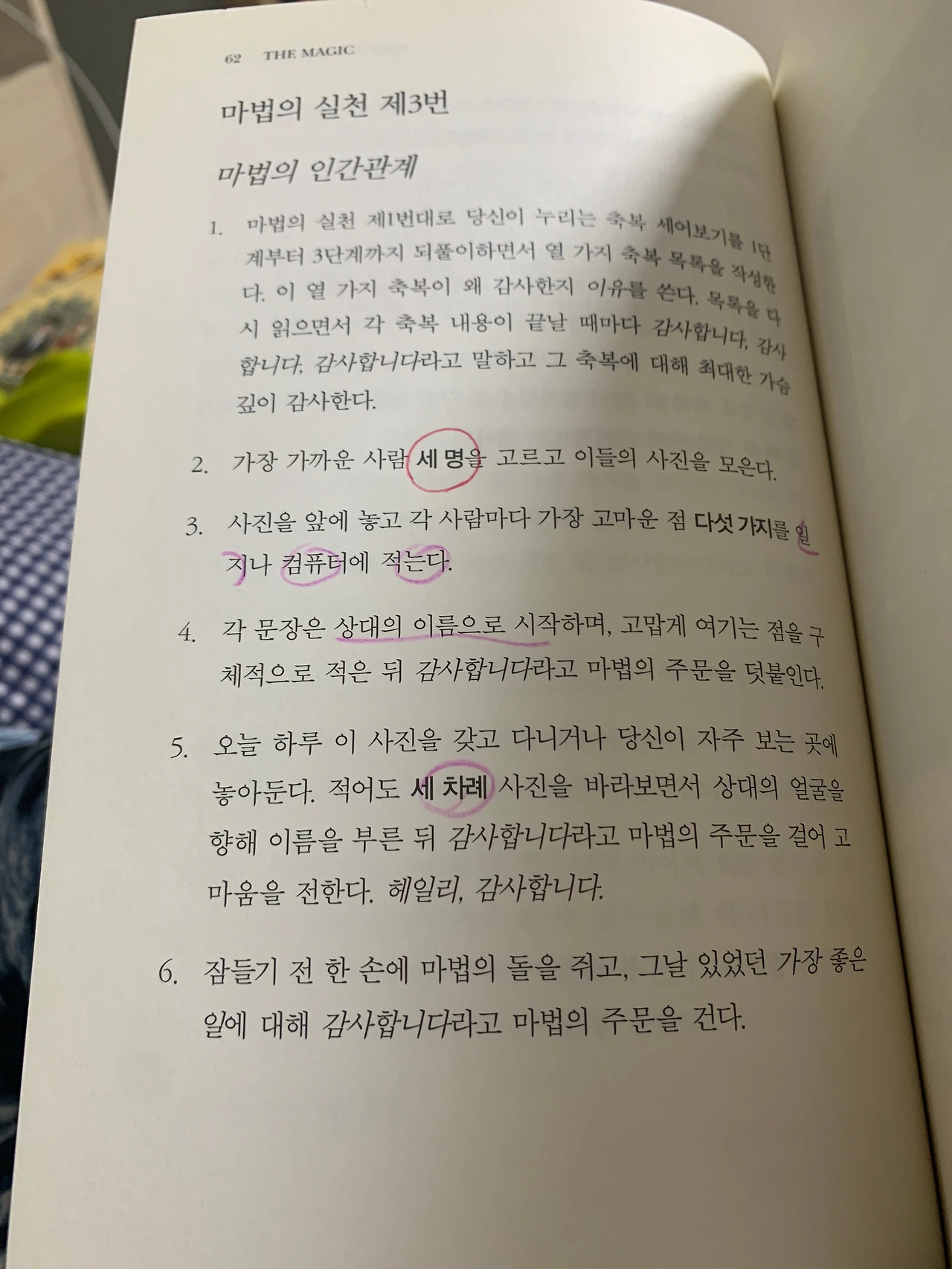 1. 마법의 실천 1번대로 당신이 누리는 축복 세어 보기를 1단계부터 3단계까지 되풀이하면서 열 가지 축복 목록을 작성한다.