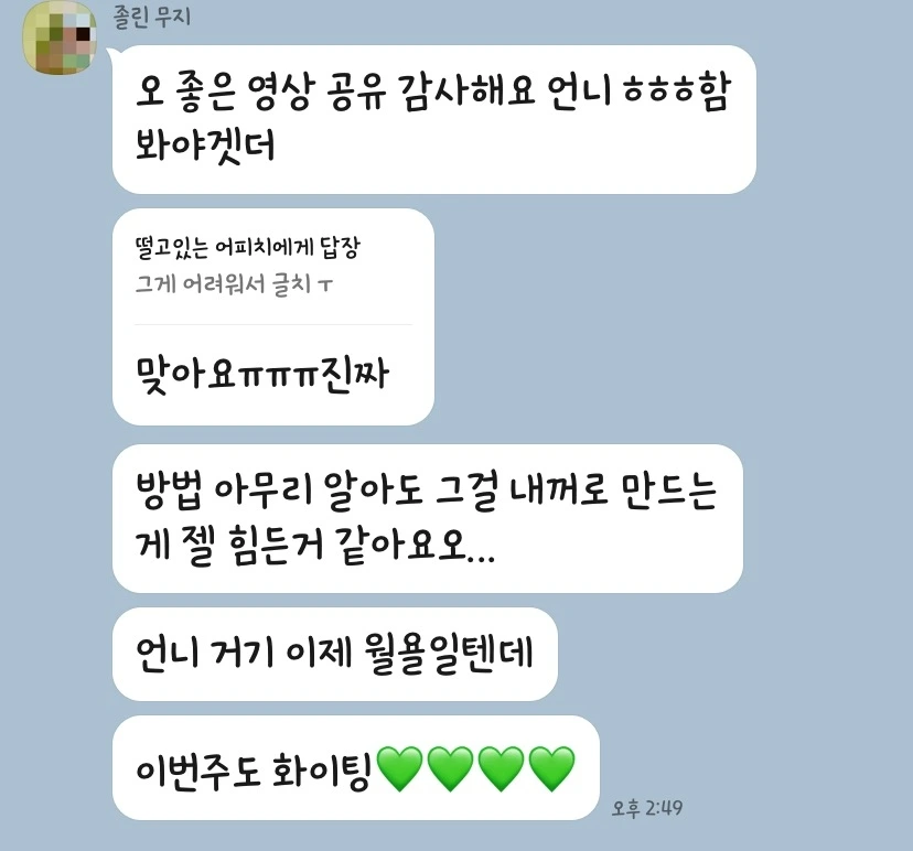 45 멀리서도 응원해주는 친구가 있어 감사합니다. 왜냐하면 그 마음씨가 너무 이쁘고 덕분에 힘이 나기 때문입니다..