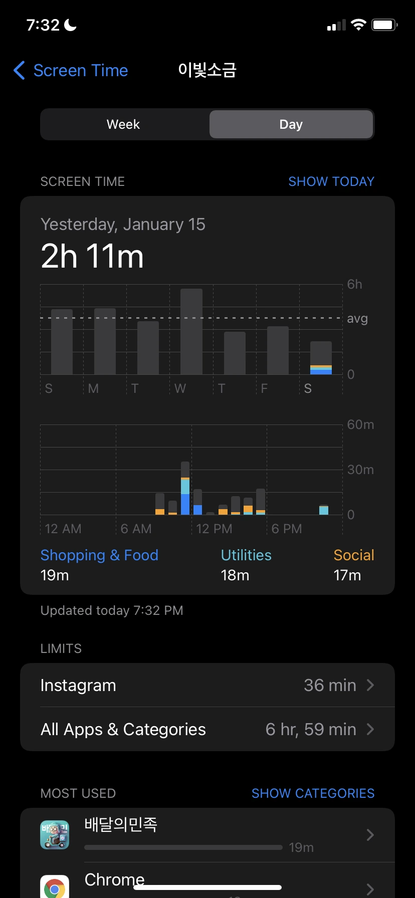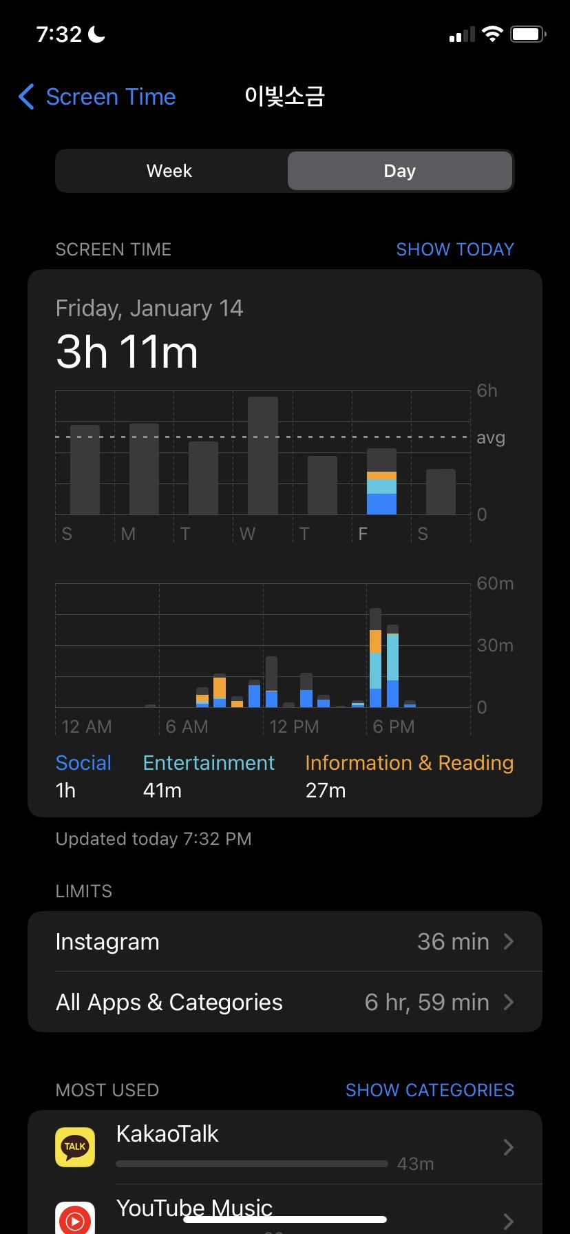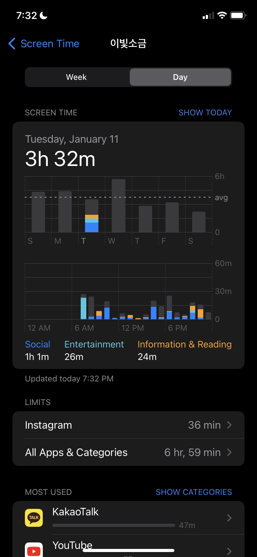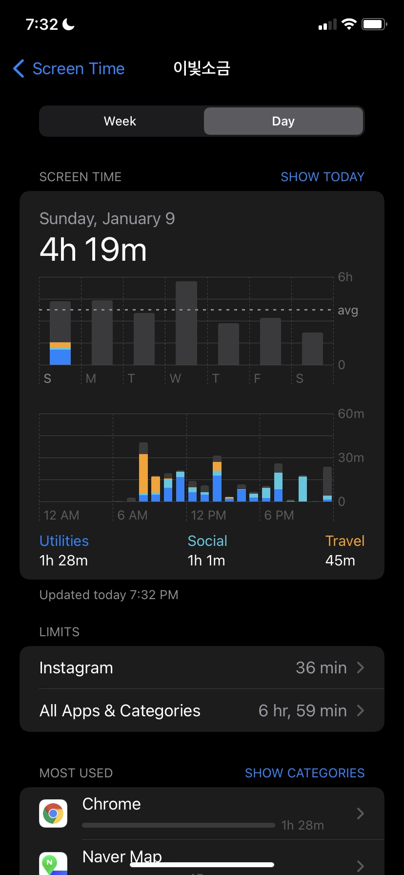 22.01.09 ~ 22.01.16 스크린 타임 기록