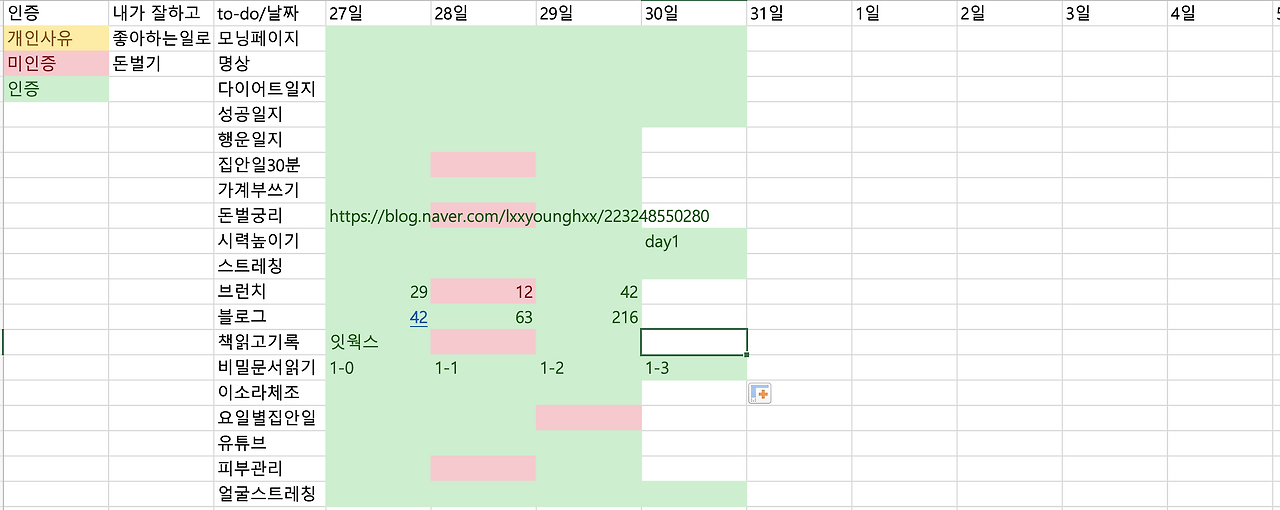 쉬는 날에 꼭 해야 하는 예약이나 약속이 되어있지 않으면 누워만 있었다. 누워만 있는 게 너무 싫었고 예전에 독서모임에서 했던 엑셀표를 만들어서 색깔을 칠하는 게 떠올라 실현하게 됐다. 색을 칠하는 재미가 쏠쏠해서인지 누워있지 않고 행동하게 된다.