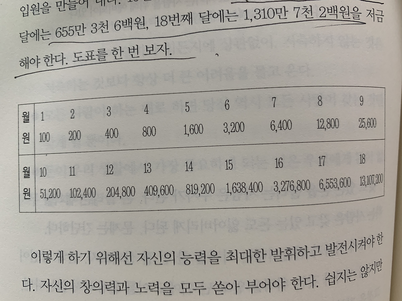 16번째 달에 당신은 327만 6천 8백원, 17번째 달에는 655만 3천 6백원, 18번째 달에는 1,310만 7천 2백원을 저금해야 한다. 도표를 한 번 보자.