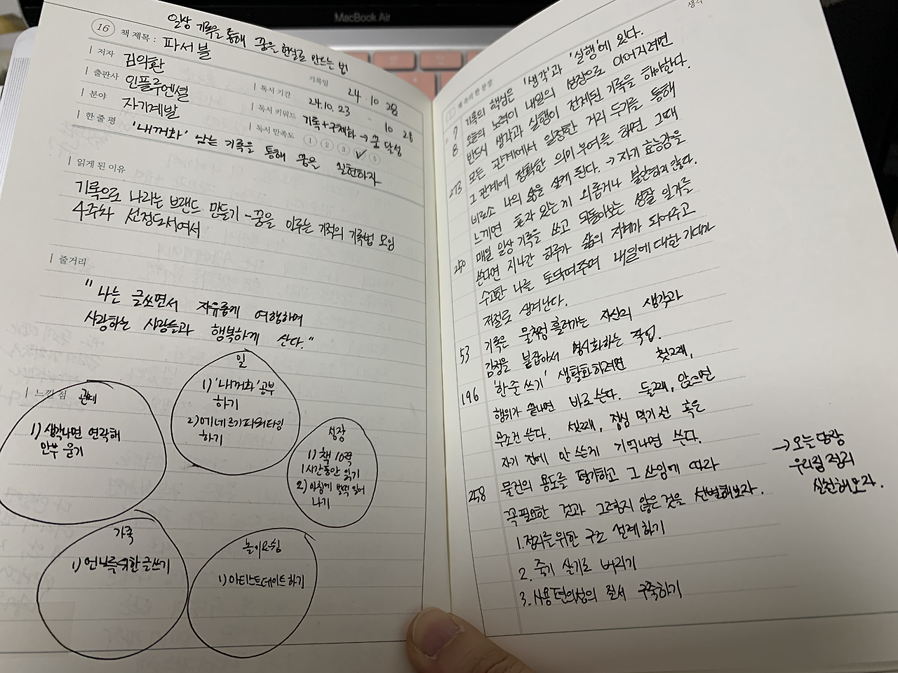 지난번에 기록모임으로 변화한 나의 모습을 적은 적이 있는데 빠진 부분이 많다. 위에 쓴 기록 대부분이기록모임 덕분에 하고 있는 것들이다. 기록모임 후로 전보다는 체계적으로 쓰게 되었지만 아직 부족하다. 본격적으로 더욱 더 체계적으로 기록해나가고 싶다. 쓸모 있는 기록을 하고 싶다. 나의 기록에 대해 궁금해해준 친구에게 고맙고, 오늘은 여기까지!