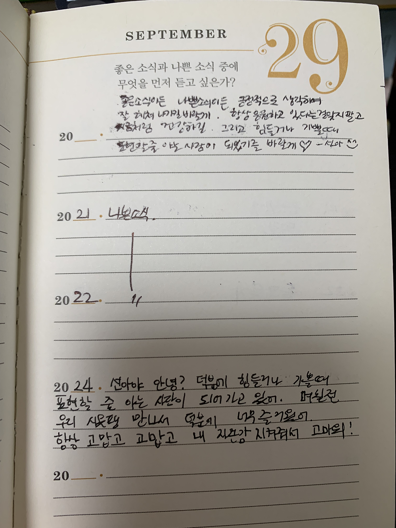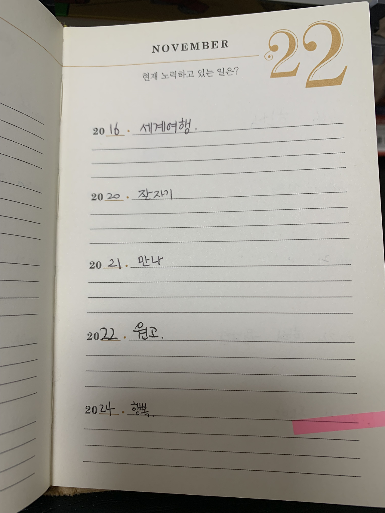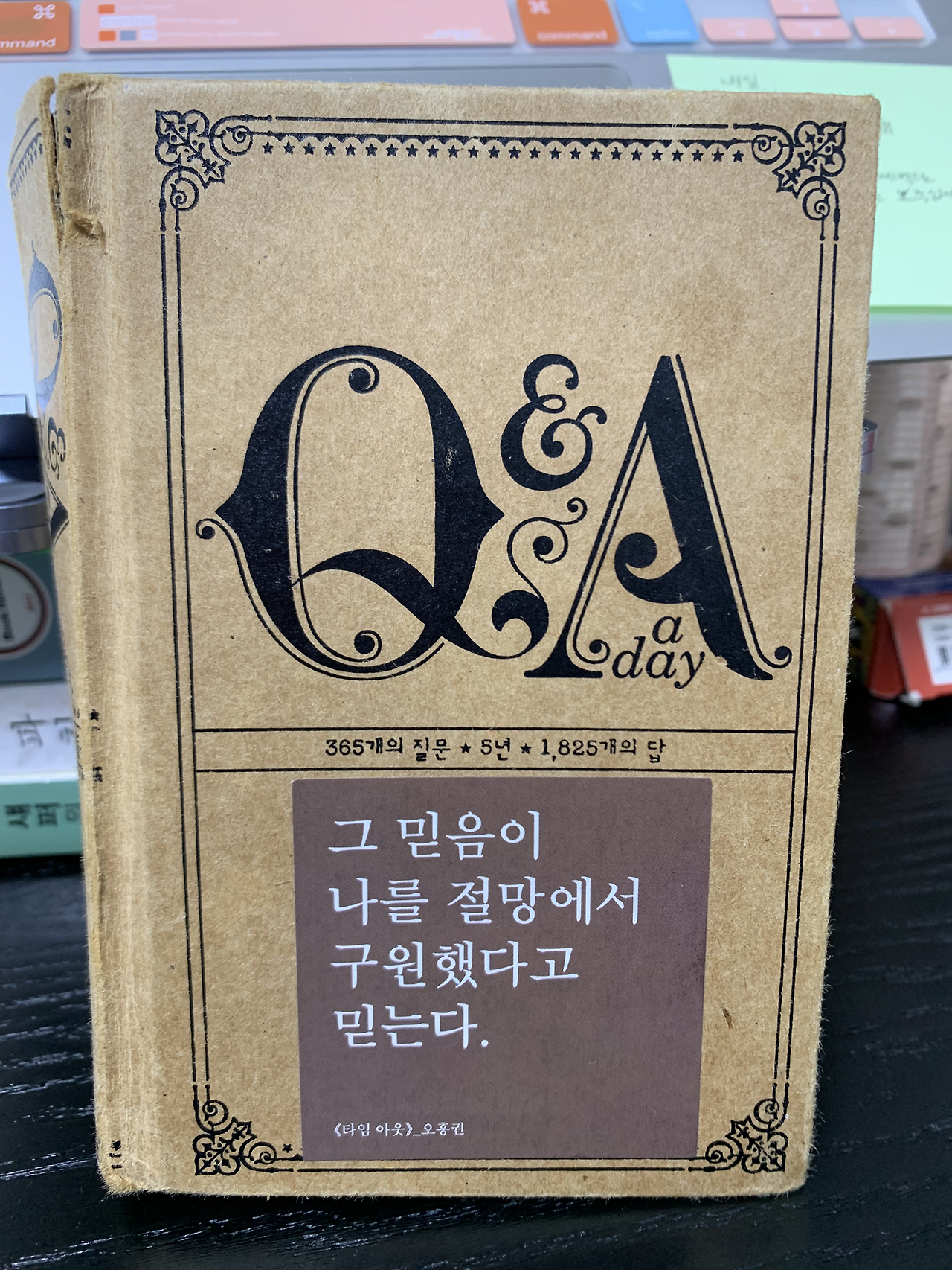 2017년에 산 거고 365일 내내 매일 다른 질문을 해준다. 그럼 n 년 전의 내가 이랬고 지금의 나는 이렇게 달라졌구나 변화를 볼 수 있어 재미가 쏠쏠하다. 2017년에 시작했고 올해 끝난다.