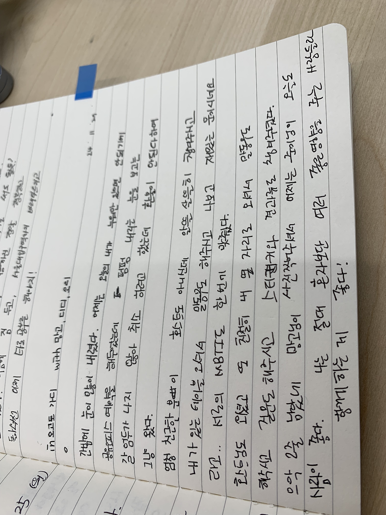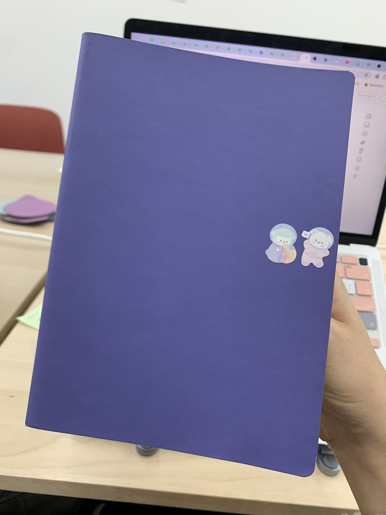소소문구에서 산 보라색 줄노트인데, 한 페이지가 위아래로 나뉘어 있어 하루에 반 페이지씩 그날 하루 일어난 일들을 가끔 쓴다. 지금 이 글을 쓴다고 전에 쓴 일기를 몇 편 읽어봤는데 피식했다. 내 일기는 내 이야기이니까 재밌을 수밖에 없다. 악필이라서 글씨를 더 잘 쓰고 싶은 마음에도 꼭 손으로 쓴다.