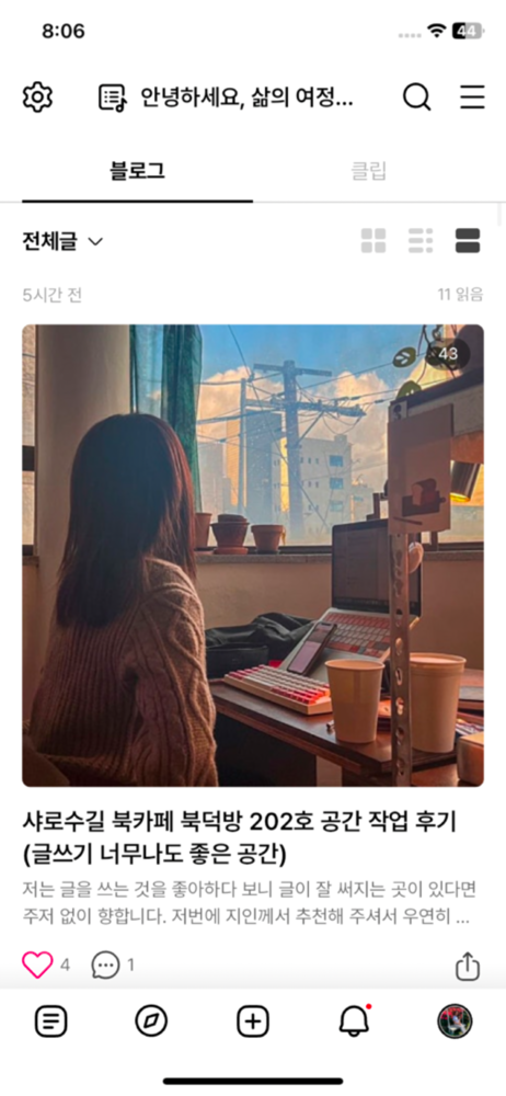 최근에는 공간플랫폼인 스페이스클라우드 에디터로 선정이 되어서 이용후기를 올린다. 좋았던 카페나 맛있었던 맛집도 올렸다. 어제는 의식의 흐름대로 일기도 썼다.