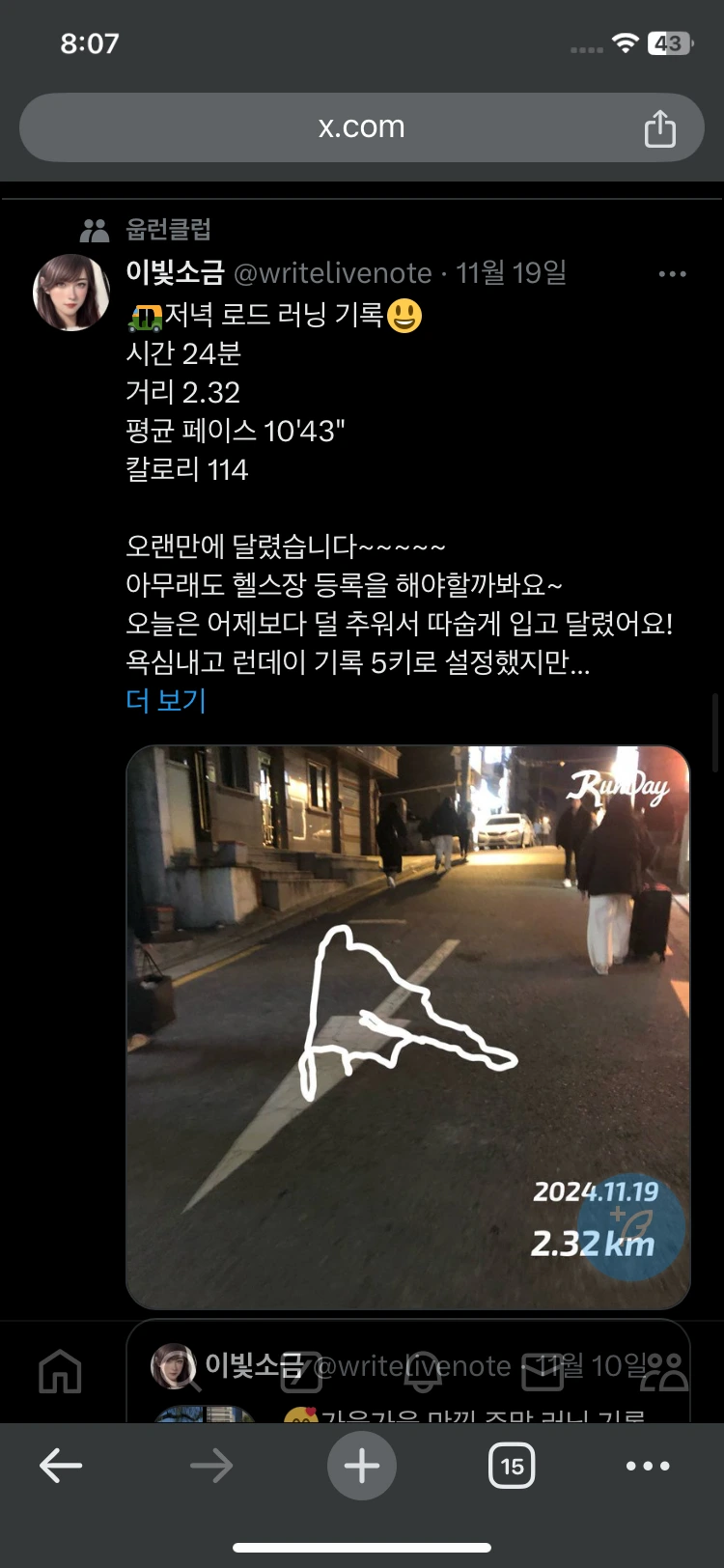 주로 하는 기록은 달리기 기록, 웁런클럽이라는 곳에 달리고 난 뒤 소감과 함께 기록한다. 웁런클럽의 회원분들의 격려와 지지 덕분에 신나서 동기부여하고 달리려 노력한다.