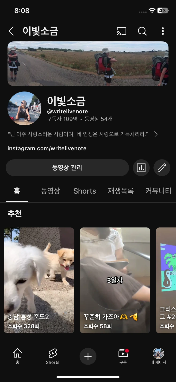 기록모임 벙개 때 모임 분들께서 "엔프피는 크리에이터를 해야 한다"라고 말씀해 주셔서 최근 다시 하게 됐다. 핸드폰에 비디오 숫자가 3000개 정도 됐는데, 유튜브에 기록하게 되면서 1500개 정도로 줄었다. 구독자도 109명 됐다.