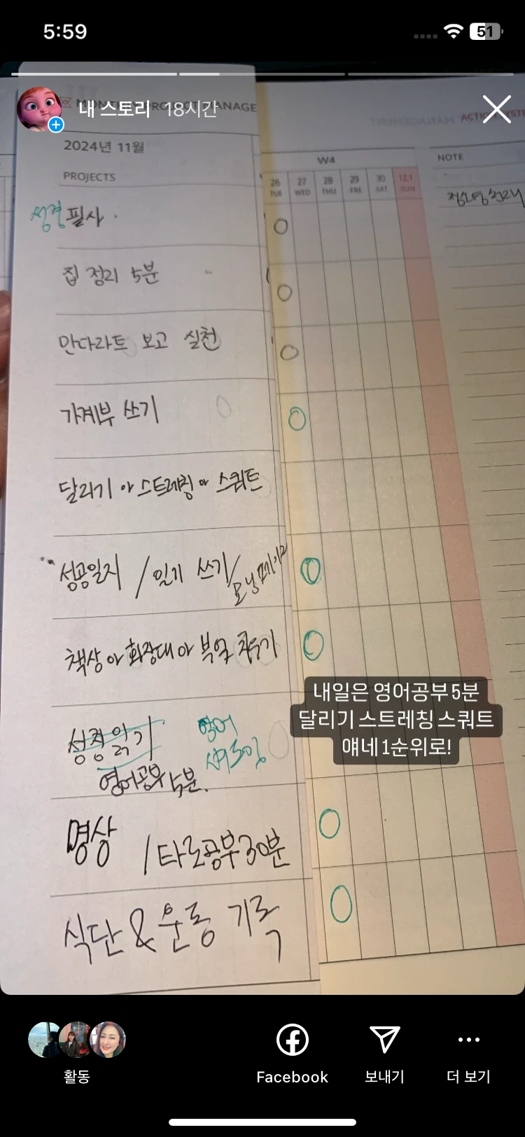 친구가 윈키아플래너를 쓴다고 하는 얘길 들었는데, 또 유튜버 정다르크님도 쓴다고 하기에 22년도에 믿고 쓰게 되었는데 좋아서 24년도에도 쓴 플래너다. 윈키아플래너에서 개인적으로 제일 좋은 점은 매일 해야 하는 습관을 쓰고 o, x로 그날그날 체크할 수 있는 게 있는데 그를 통해 습관을 형성하는데 도움을 준다. 어제는 스트레칭&달리기&스쿼트와 영어공부를 하지 않아서 오늘은 1순위로 그것들을 하겠다고 마음을 먹게 됐다.