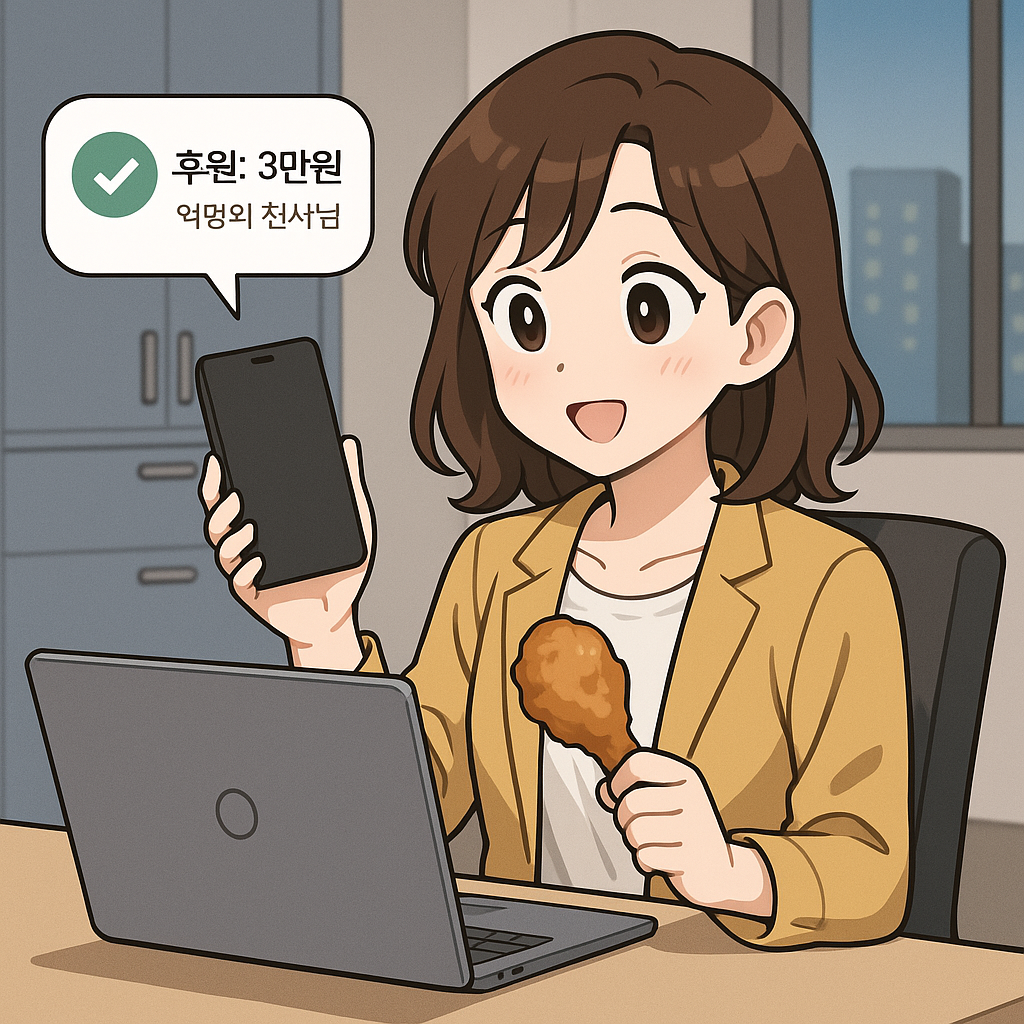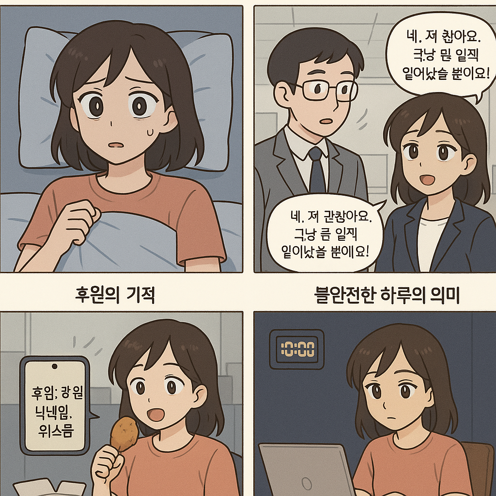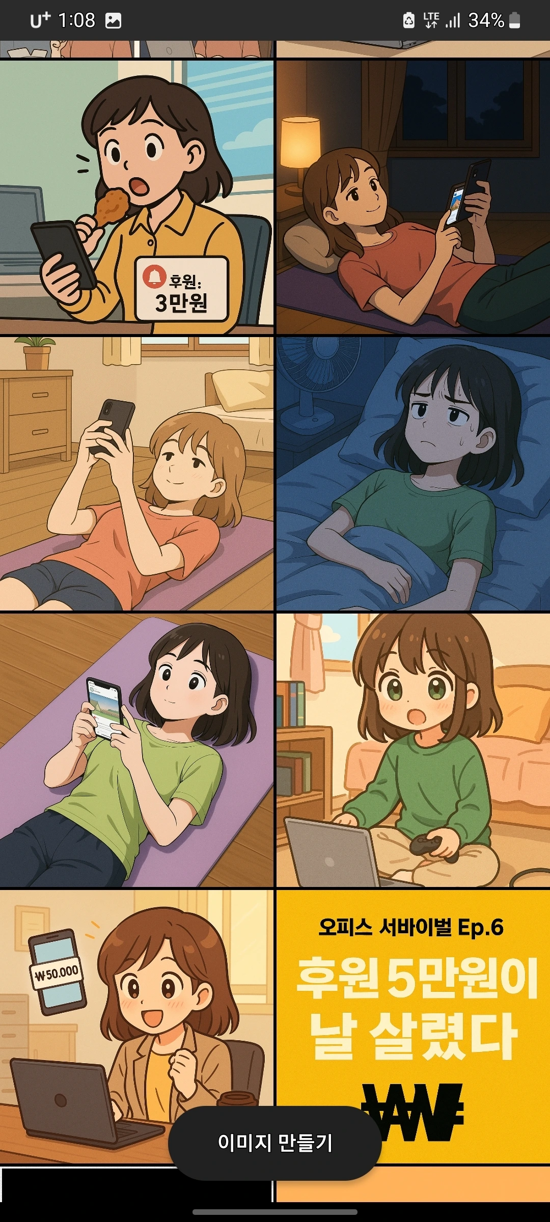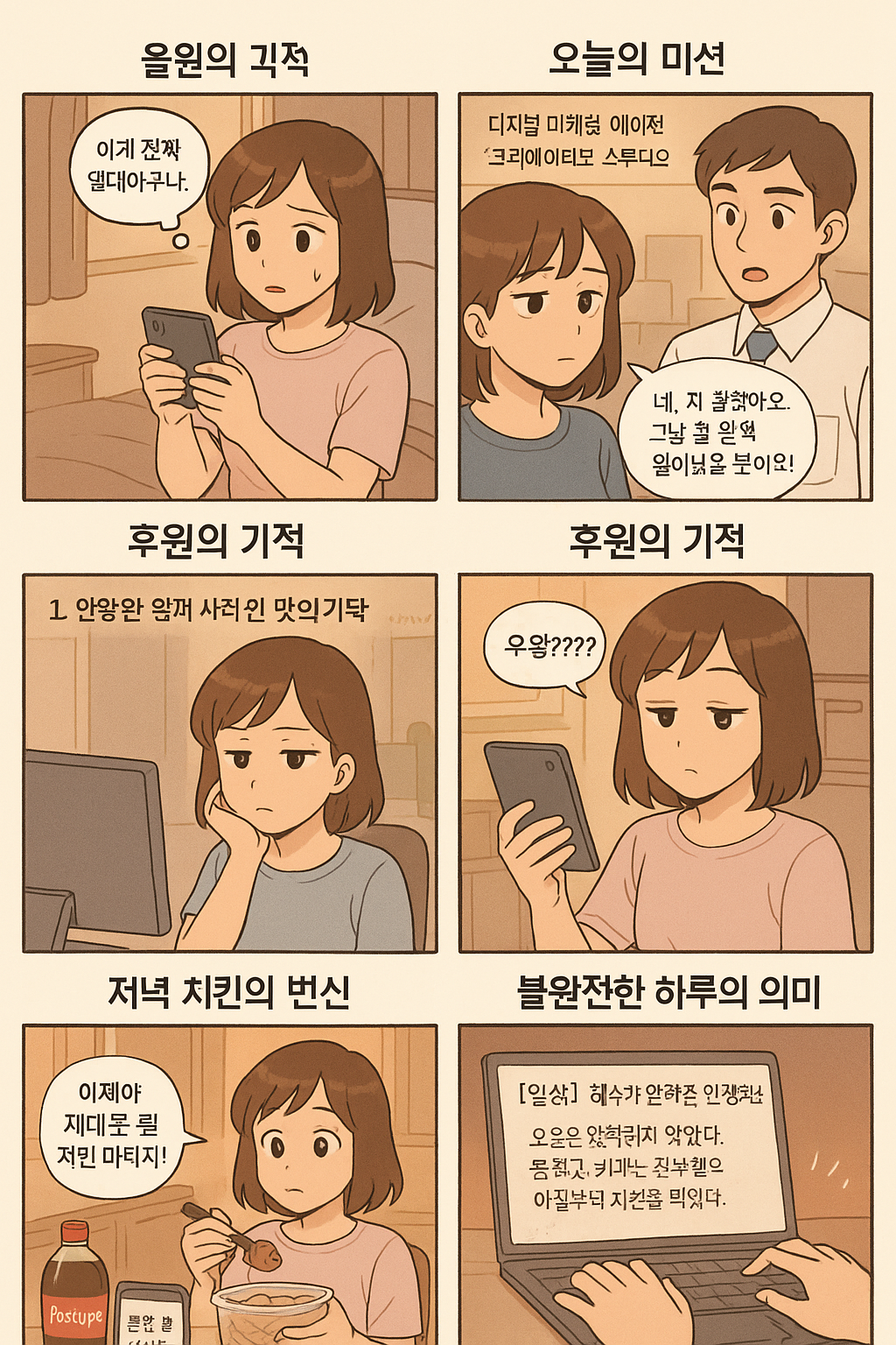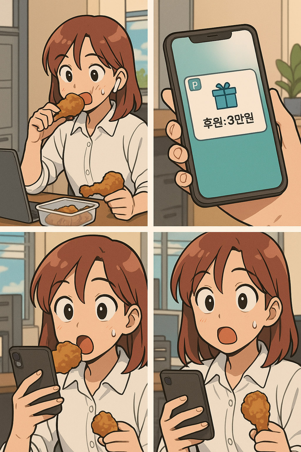 김 부장이 또 사무실에 있었지만 상관없었다. 아정은 이제 각성했고, 돈을 아끼기로 했기 때문이다. 이어폰을 끼고 차가운 치킨을 베어 물었다. 그 순간, 핸드폰에 띵똥 하고 알림 소리가 들렸다.