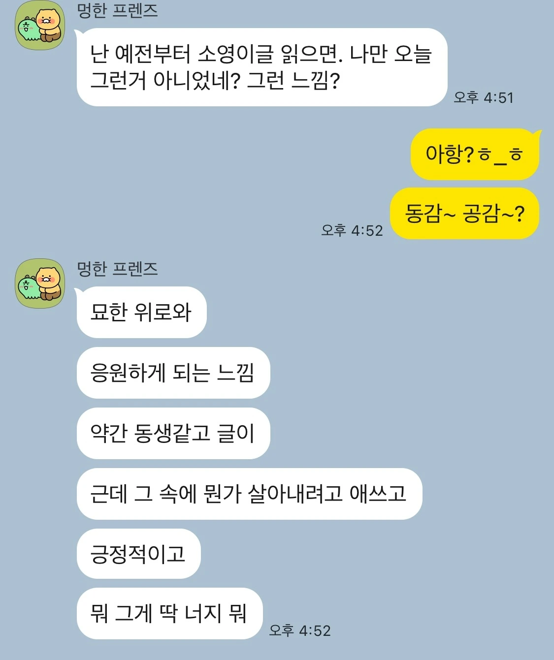 “바쁘게 살면서 생각도 못 하고 지나쳤던 감정, 사람, 마음의 결. 너무 무겁지도, 너무 가볍지도 않게 하루 한 번, 조용히 들여다보게 하는 글.“