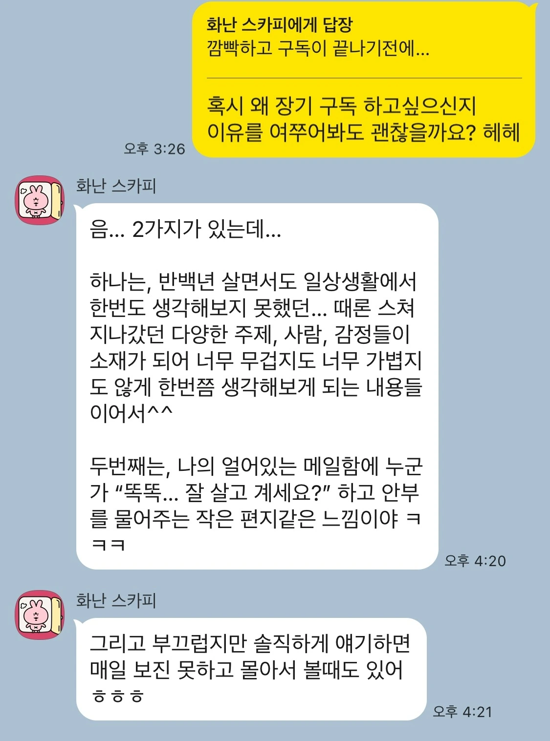 발송 시간: 저녁 6시~7시 사이를 원칙으로 하나, 글의 완성도를 위해 종종 밤이나 새벽까지 이어질 수도 있습니다.