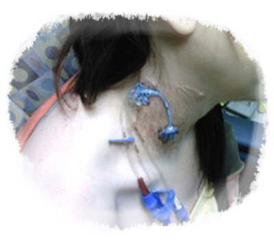 이제 뿌리를 떼어낼 차례다. c-line을 제거해야 한다. cut scissor로 c-line 봉합 부위를 잘라내고 4x4거즈로 지혈한 후에 베네스톡이라는 반창고로 고정한다. 출혈을 방지하기 위해 모래주머니를 c-line을 제거한 부위에 둔다.