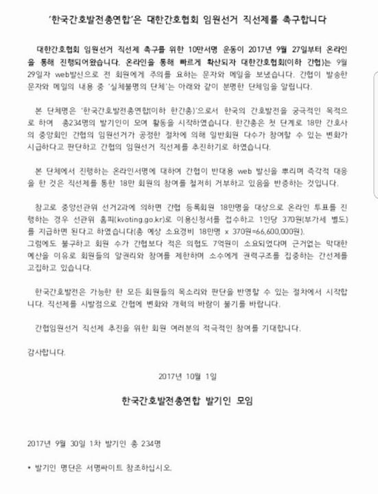 대한간호협회 임원선거 직선제 촉구를 위한 10만서명 운동이 2017년 9월 27일부터 온라인을 통해 진행되어왔습니다.