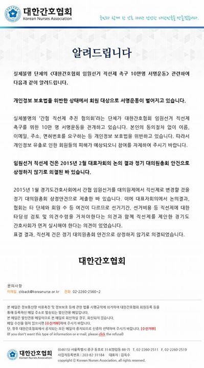 본 단체에서 진행하는 온라인서명에 대하여 간협이 반대용 web 발신을 뿌리며 즉각적 대응을 한 것은 직선제를 통한 18만 회원의 참여를 철저히 거부하고 있음을 반증하는 것입니다.