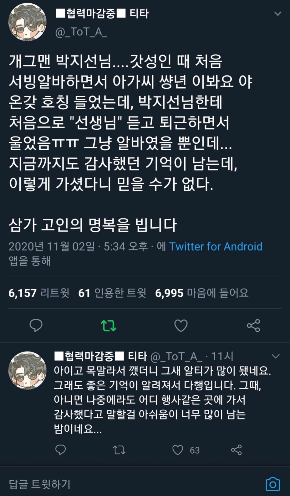 아이돌 가수 팬미팅때도 ‘당신들은 남을 싫어하는 데 애쓰는 게 아니라 좋아하는 데 애쓰는 사람들이다’는 식으로 소신 있게 말하기도 했다. 학교 선생님으로 안정적으로 살 수 있는데도 본인 원하는 길 찾는 뚝심 있는 사람. 남한테 해코지 한 번 안 한 선량한 사람이였는데 이렇게 하루아침에 가버리는 게 참으로 허무하다.