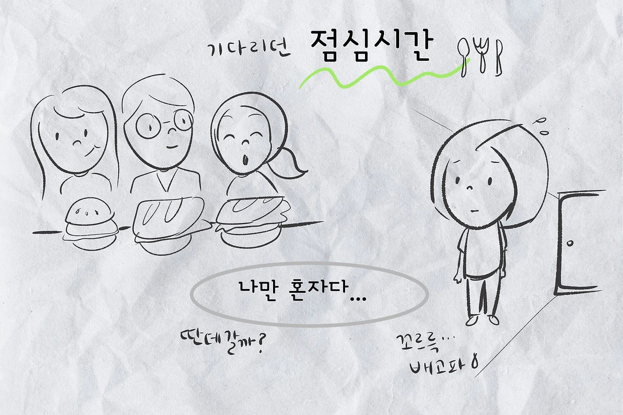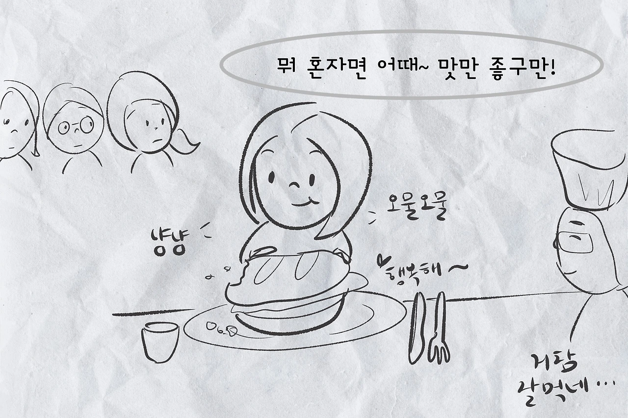 오늘은 글 대신 일상툰이라는 새로운 시도를 해봤어요. 혼밥을 주제로 나름 열심히 그려봤는데 아직 많이 어설프네요. 뭐든 처음은 다 어려운 거겠죠?^^;