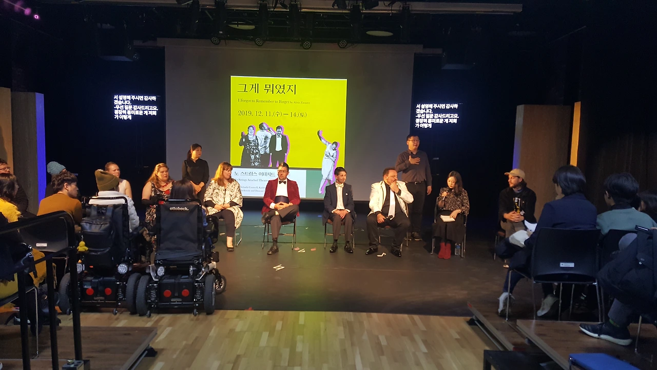 당시 나는 해외 장애예술단체 및 예술가들과 함께 해외 공연 쇼케이스에서 통번역사로 일했다. 그때 만난 호주에서 온 '노 스트링스 어태치드 장애 극단'은 극단 이름처럼 다양한 장애를 가진 단원들로 구성되어 있었다. 그중에는 학습장애를 가진 배우도 있었고 과거에 뇌졸중을 앓은 배우도 있었다. 이 극단은 호주에서 호평받은, 기억과 망각을 주제로 한 연극 'I Forgot to Remember to Forget(국내에서 채택된 제목은 <그게 뭐였지>이다)'을 한국에서 처음으로 상연하게 되었고, 나는 이 연극의 자막을 한국어로 번역하는 임무를 맡았다. 그리고 공연 후 관객과의 대화와 워크숍 통역까지 맡게 되면서 나는 이 극단과 긴밀하게 일할 수 있었다.