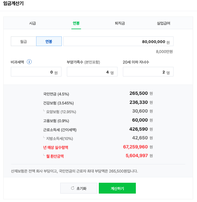 아래와 같이 현재 8,000천만 원의 연봉을 받고 있다고 가정해 보겠습니다. 내 통장에 매월 찍히는 월급은 5백6십만 원입니다. 그리고 여기서 추가로 매월 100만 원의 영업 지원비를 세후기준으로 받고 있다고 해 보겠습니다. 그럼 통장에 찍히는 금액은 최종 6백6십만 원(5백6십만 원 + 100만 원)입니다.