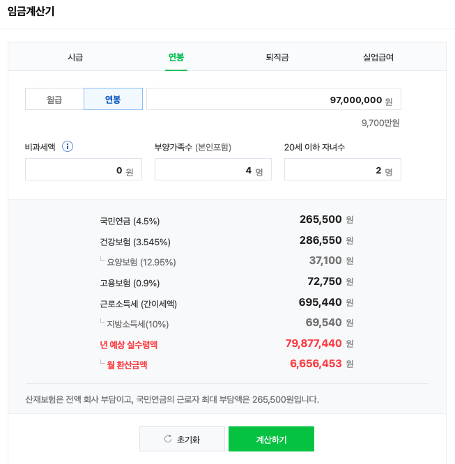 6백6십만 원의 월급을 통장에 찍히게 하기 위해서는 어느 정도 연봉을 받아야 할까요? 아래와 같이 계산해 본 결과 9천7백만 원의 연봉을 받아야 합니다. 연봉이 20% 좀 넘게 인상이 되었습니다. 보통 이직 시 연봉을 10% 인상을 하기 때문에 이 금액에서 추가 협상이 가능합니다. 그리고 몇 가지 더 협상할 수 있는 부분등을 고려하면 기존 연봉에 30~40% 인상을 기대해 볼 수 있습니다.