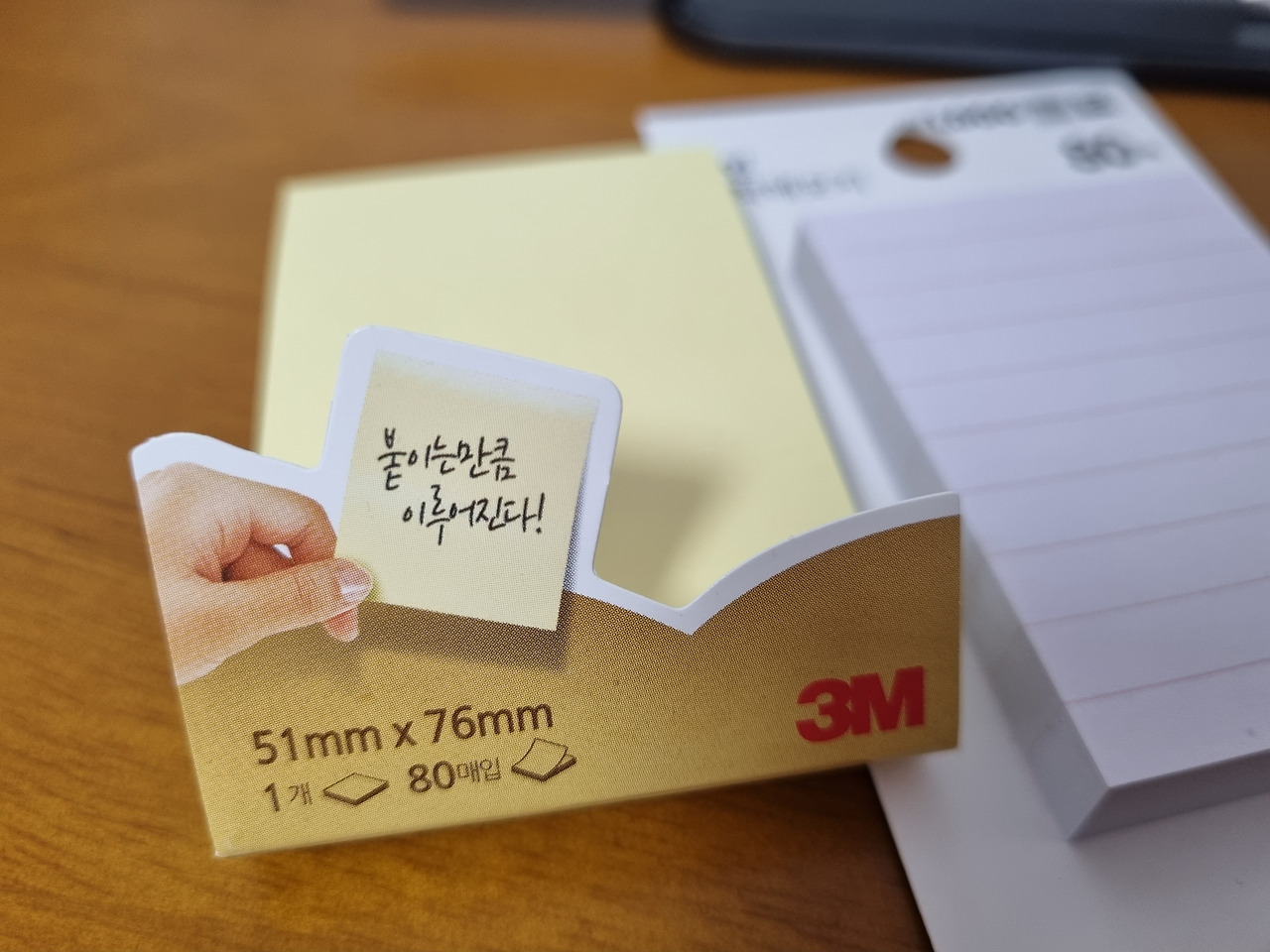 독서대 위(맞다, 독서대를 독서대로 사용하고 있지 않다) 연노랑 ‘포스트-잇 노트’ 뒤에 또 다른 ‘₩1,000’이 보인다. 그건 라인 점착메모지. 지난주에 다이소에서 사 온 문구들이다. 이 문구들 외에 ‘3M 스카치 다용도테이프 리필 2입’과 ‘에어프라이어 종이호일 35매입’도 같이 구입했다.