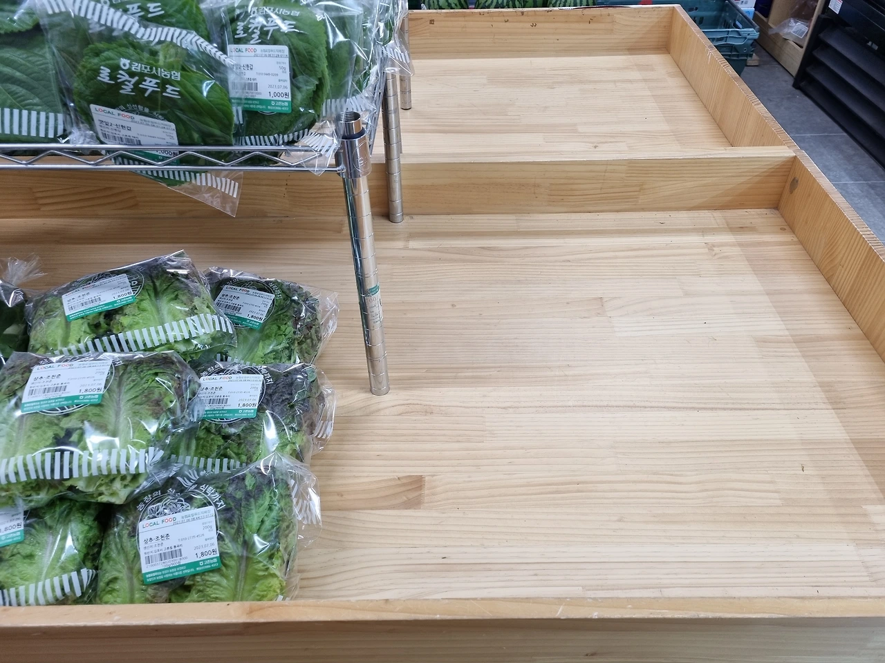 내가 계산도 안 하고 서성거리고 있으니까 “뭐 필요한 거 있으세요?” 물어온다. 꽃상추 농부 분이 아직 가게에 있어 미안한 마음으로 “네, 청상추요….” 얘기했다. 그때 드디어 상추 상자를 들고 들어오는 분이 나타났다. 맨 끝자리에 채소를 진열하시는데 이런, 청상추가 아니라 꽃상추네.