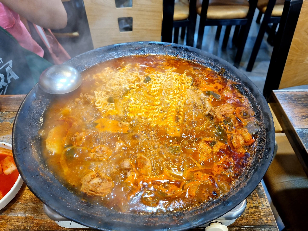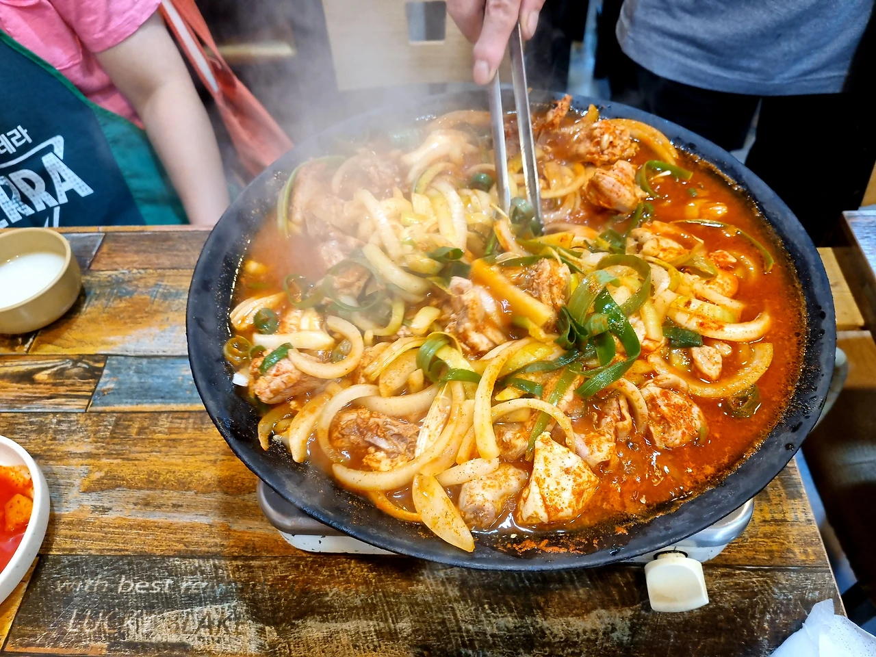 그리고 잠시 뒤, 사장님이 뻘건 국물이 찰랑찰랑 거리는 솥뚜껑을 뒤집어 놓은 듯한 모양의 깊지 않은 팬(그 팬을 그리들이라고 부르는 걸 이번에 알게 됐다)을 들고 오셨다. 팬 가장 위에는 생닭이 펼쳐져 올라가 있었고 주변부에는 떡볶이 떡, 대파 채, 얇게 썬 감자 등이 있었다. 나는 팬에 눈을 고정시키고 육수가 얼른 끓기만을 기다렸다. 그곳에 있는 나 자신도 어색하고 육수 위에 덩그러니 놓인 생닭도 낯설기만 했다. 다행히 알맞은 타이밍에 사장님이 가위와 집게를 들고 테이블로 와 생닭을 뼈째 가위로 서걱서걱 잘라주셨다. 나는 사장님의 손놀림에 집중하며 혼자만의 어색함을 달랬다.
