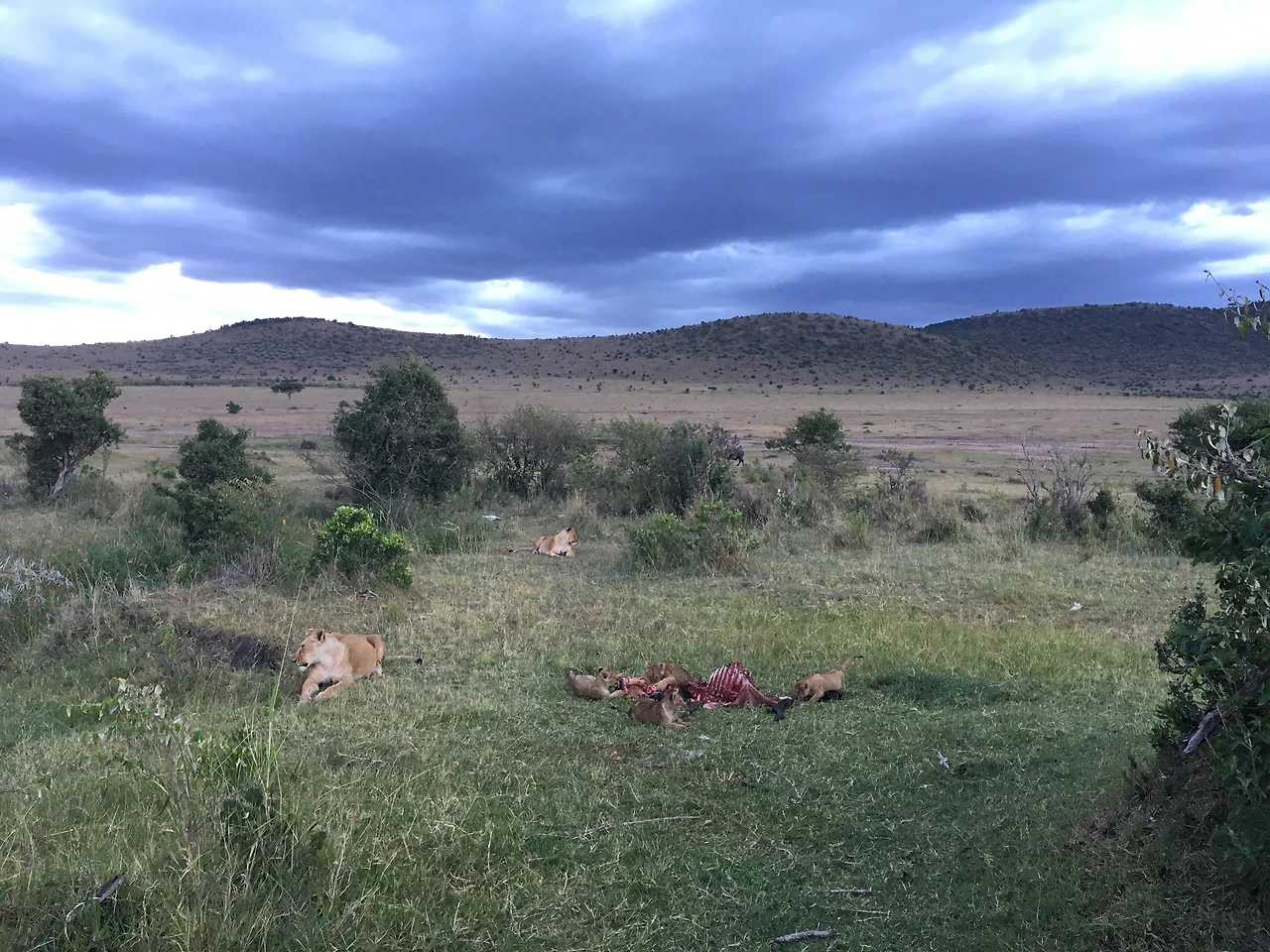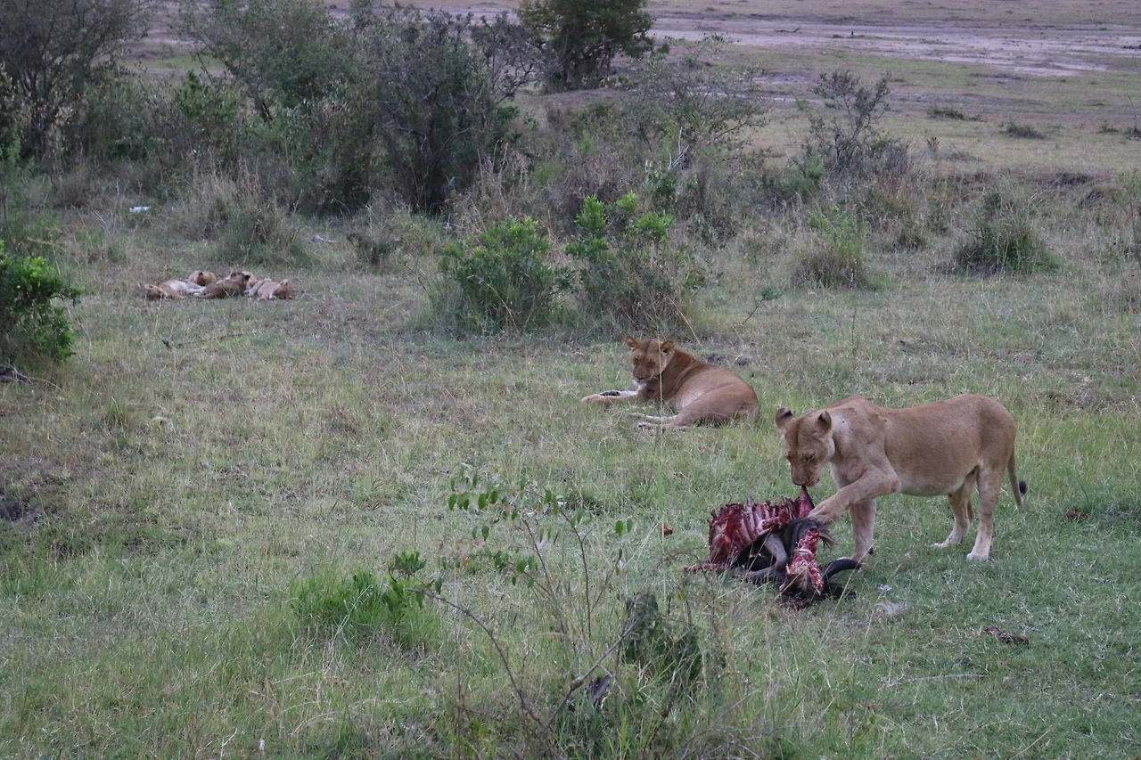 사자가족은 사냥한 저녁식사를 맛있게 하고 있었다.