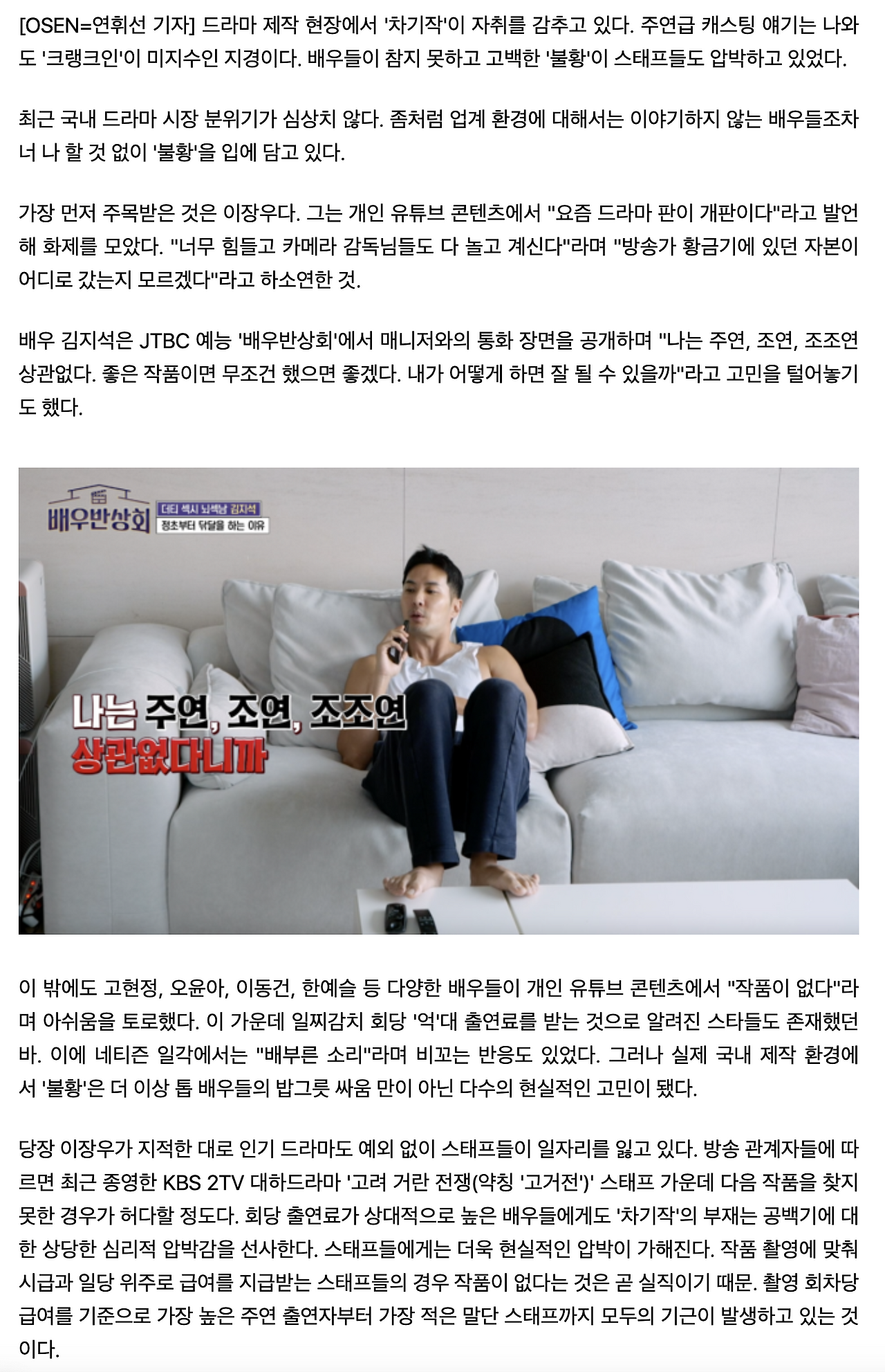 최근에는 배우들도 일자리 부족으로 걱정이 많다는 기사를 자주 접합니다. 배우들이 일자리가 없다는 것은 실질적으로 드라마나 영화 등의 대본이 부족하다는 의미입니다.