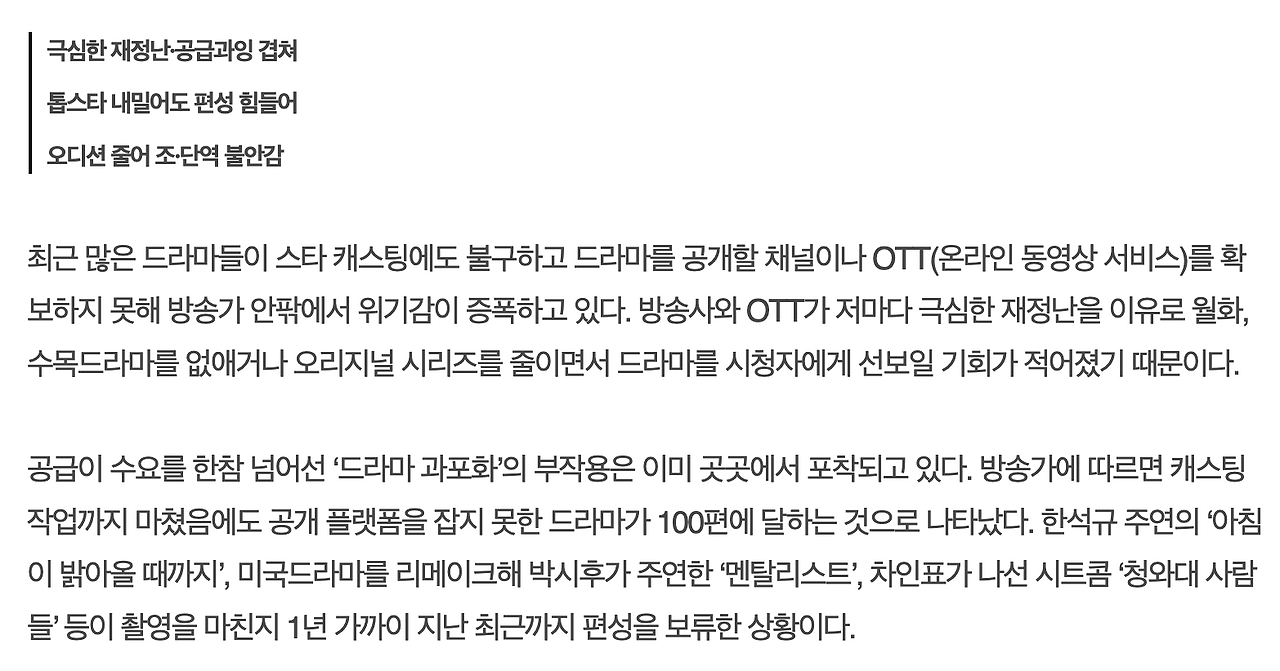 코로나19 기간 동안 OTT 시장의 호황으로 인해 제작이 완료된 드라마가 100편이 넘는다고 합니다. 하지만 이러한 드라마들이 편성 시간을 확보하지 못해 방영되지 못하고 있는 상황입니다. 현재 드라마의 시청률이 낮아져 방송 슬롯 자체가 축소되었기 때문에 방송 편성을 받지 못하는 경우가 많다고 합니다.