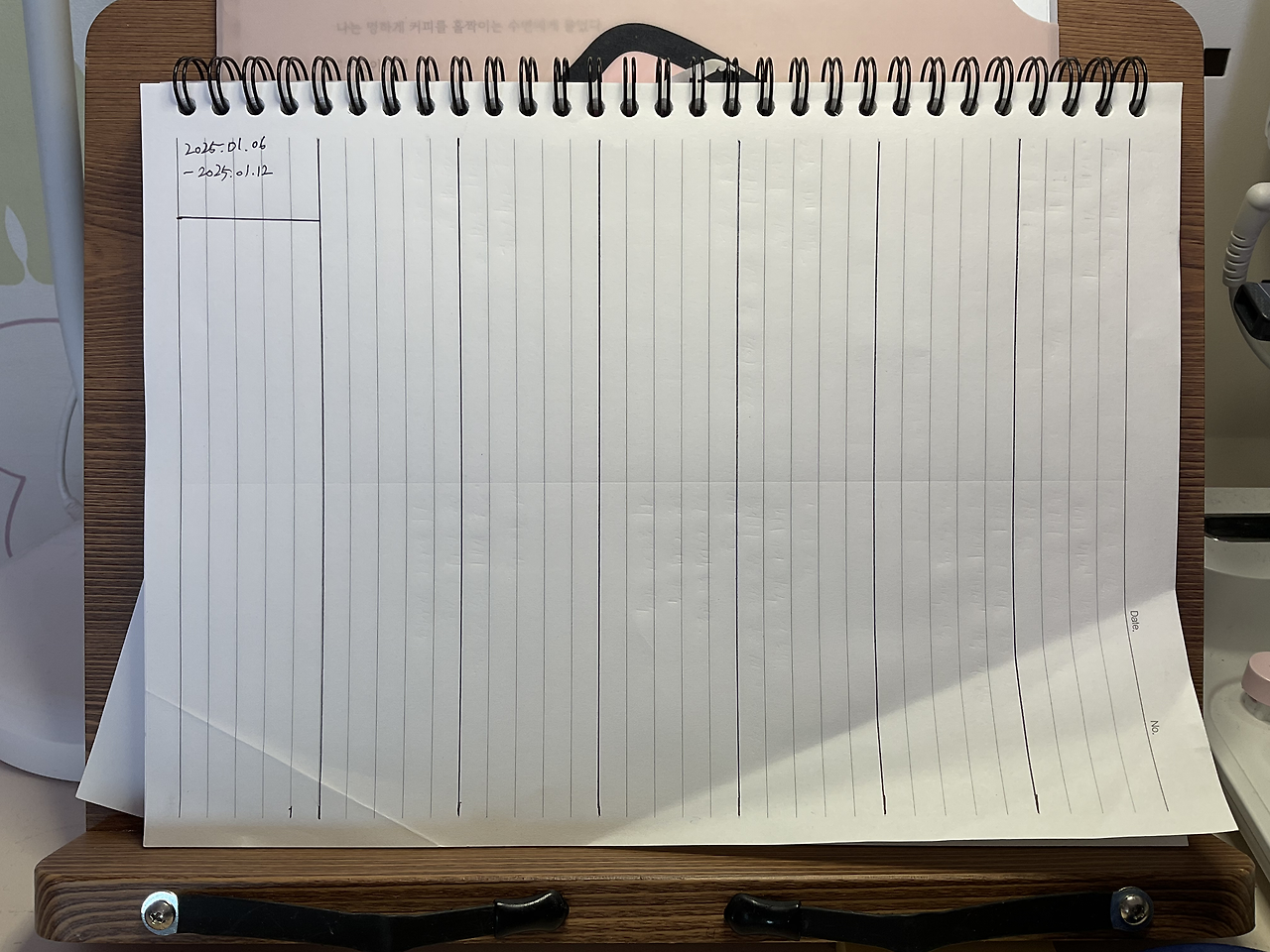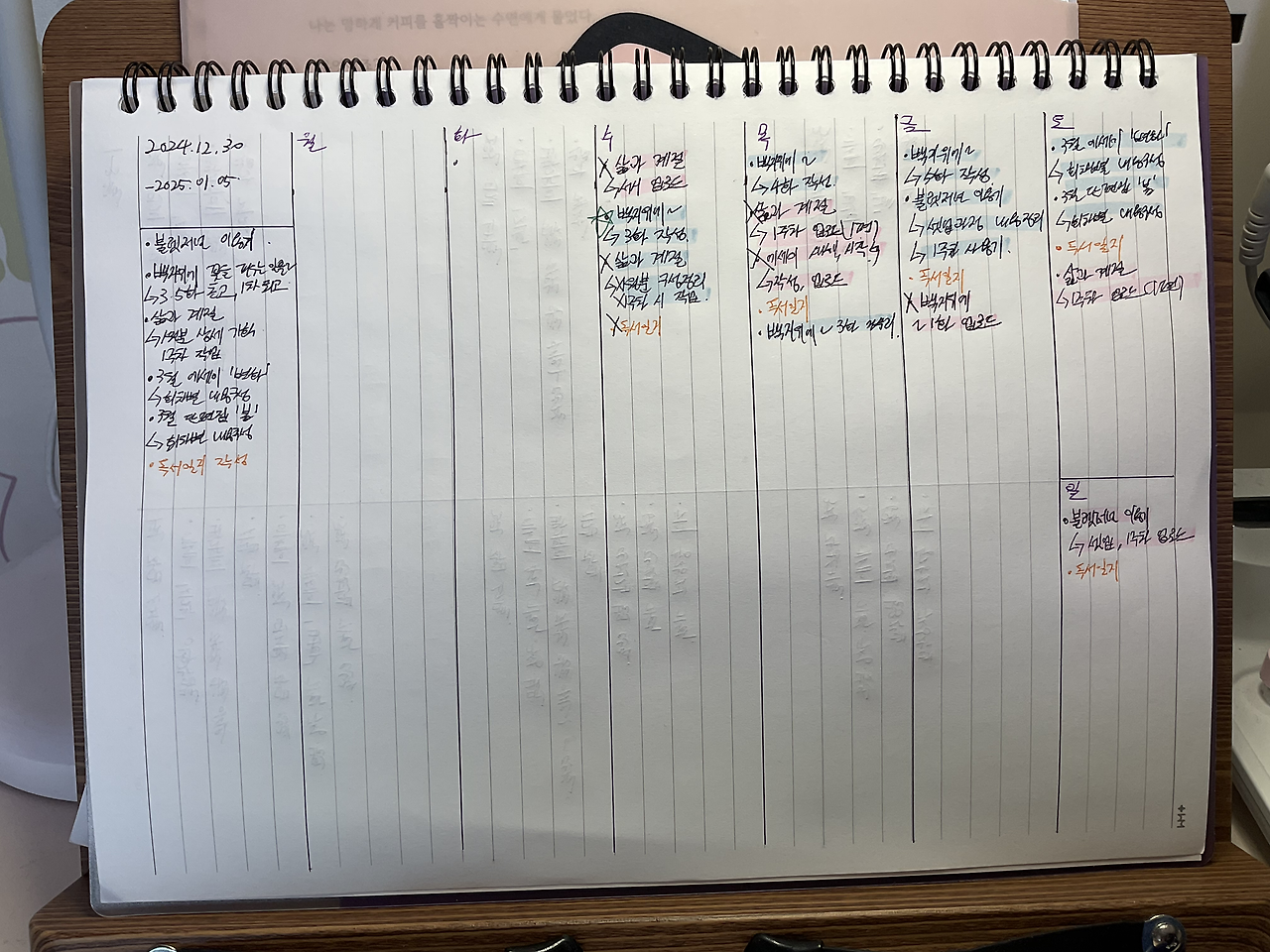 주간 계획에는 날짜(기간), 주간계획, 일별 정리칸 이렇게 세 가지 내용을 적는다. 여기서 규칙이 있다면, 할 일 체크 기호 펜 색깔별 의미가 있다.